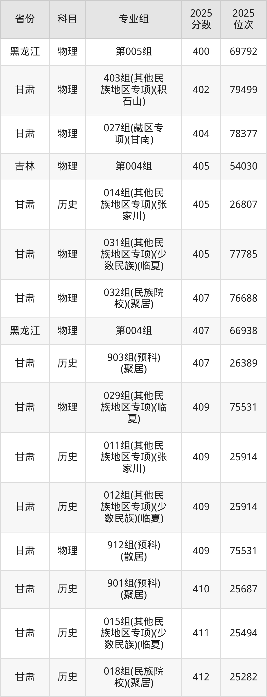 物理类:2025年甘肃民族师范学院录取最低分是400分(黑龙江),对应的位次排名是69792名。