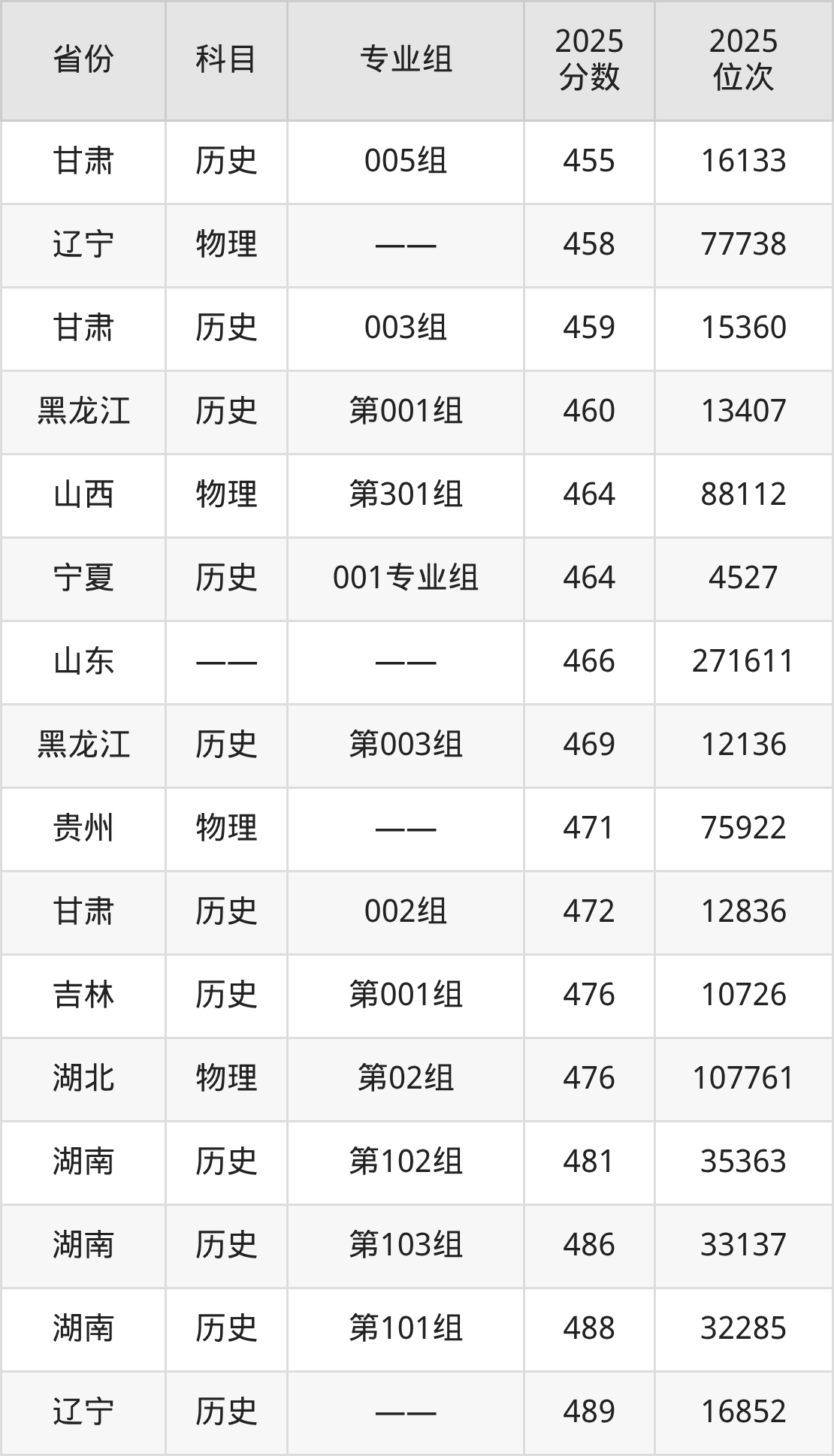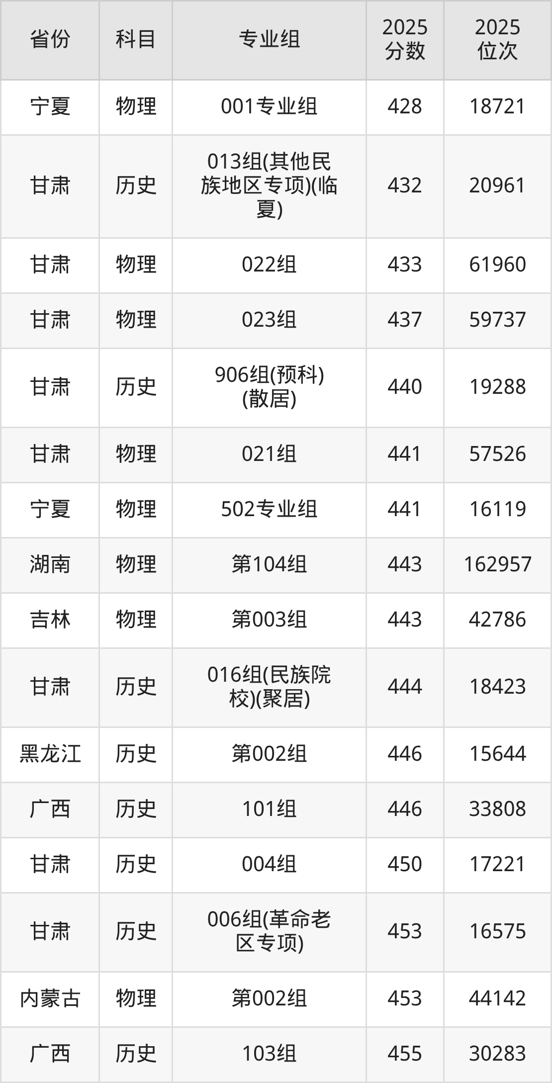 3+3地区:2025年甘肃民族师范学院录取最低分是466分(山东),对应的位次排名是271611名。