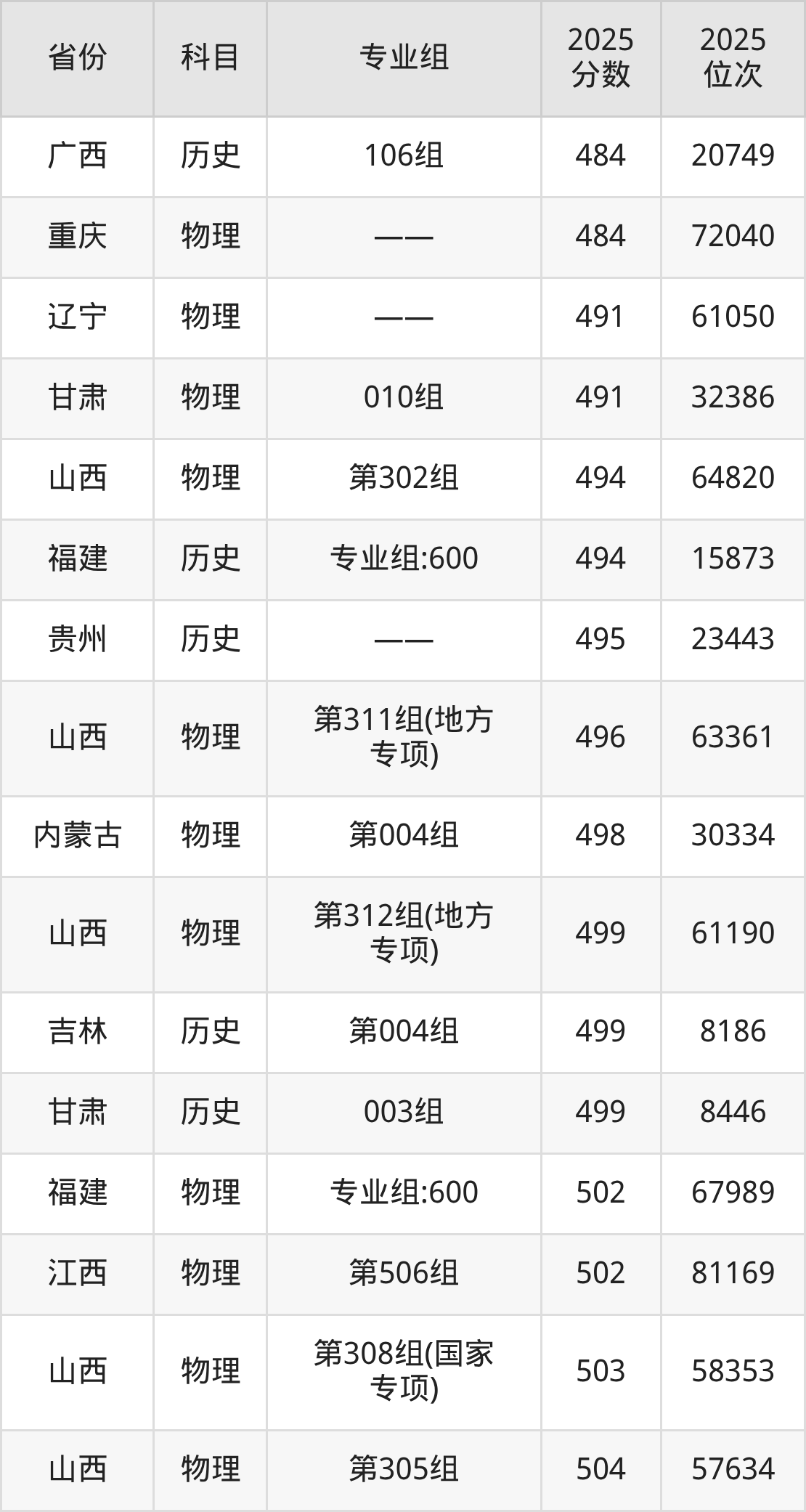 物理类:2025年山西医科大学省内录取最低分是494分,对应的位次排名是64820名。建议:如果2026年排名超过64820名,那么被该校录取的概率较大。