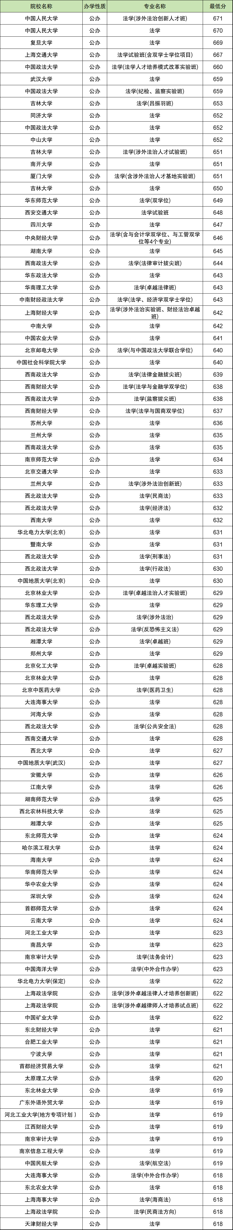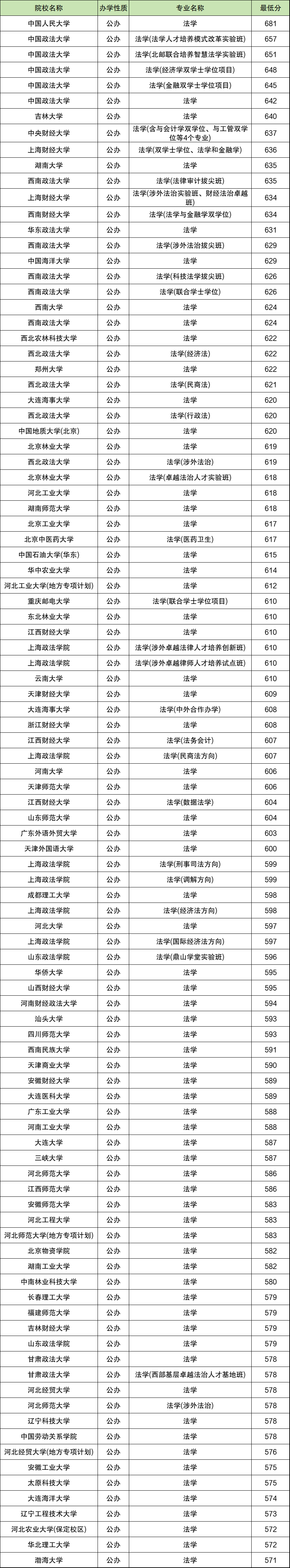 2025年全国法学各校录取分数线