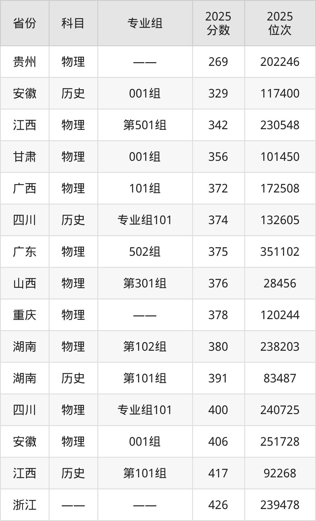 物理类:2025年江西工业职业技术学院录取最低分是269分(贵州),对应的位次排名是202246名。