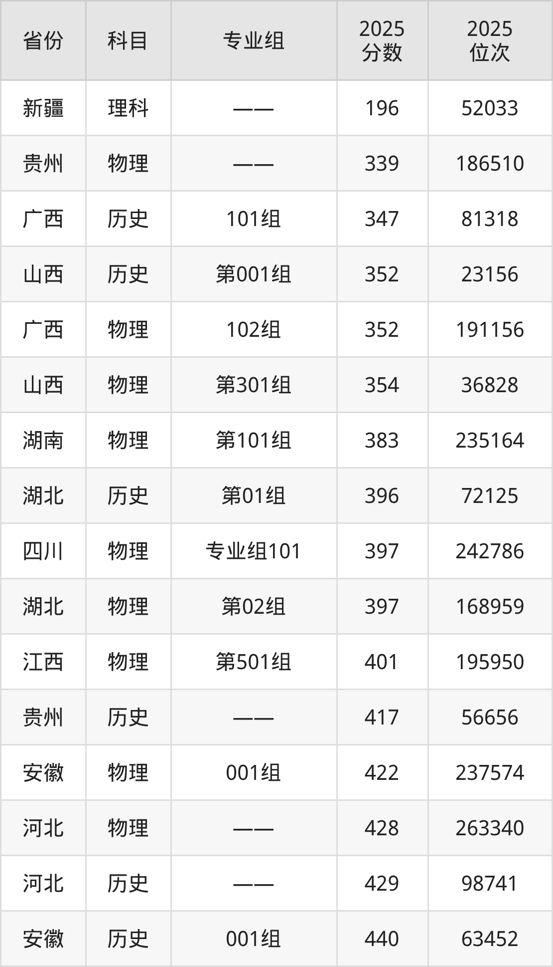 物理类:2025年浙江安防职业技术学院录取最低分是339分(贵州),对应的位次排名是186510名。