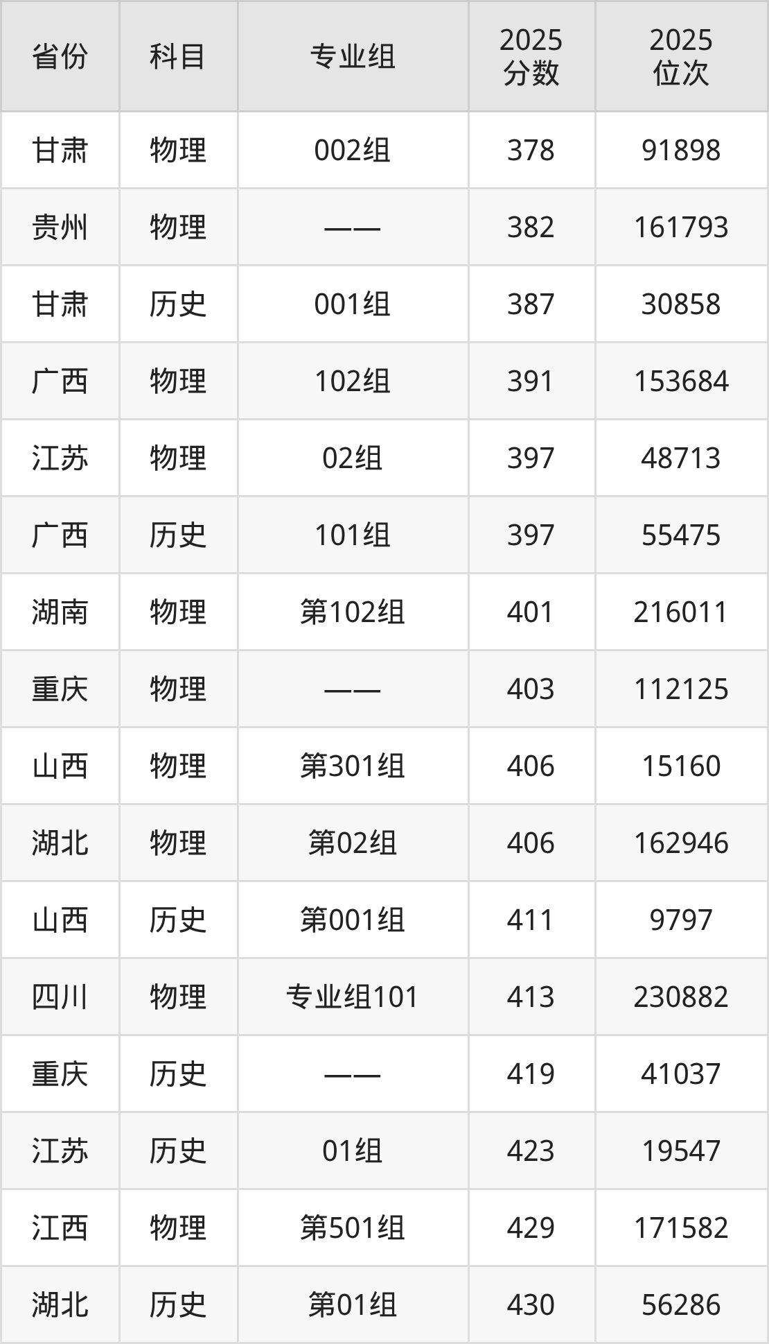 物理类:2025年江苏城市职业学院录取最低分是378分(甘肃),对应的位次排名是91898名。