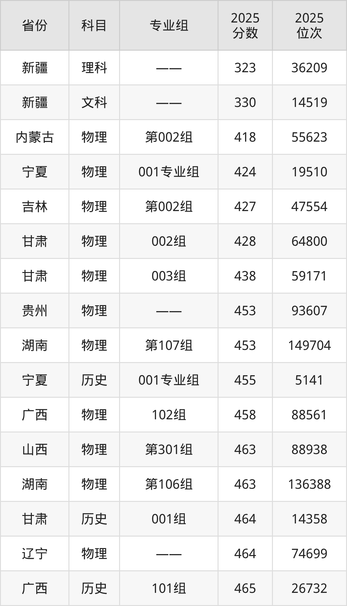 理科:2025年萍乡学院录取最低分是323分(新疆),对应的位次排名是36209名。