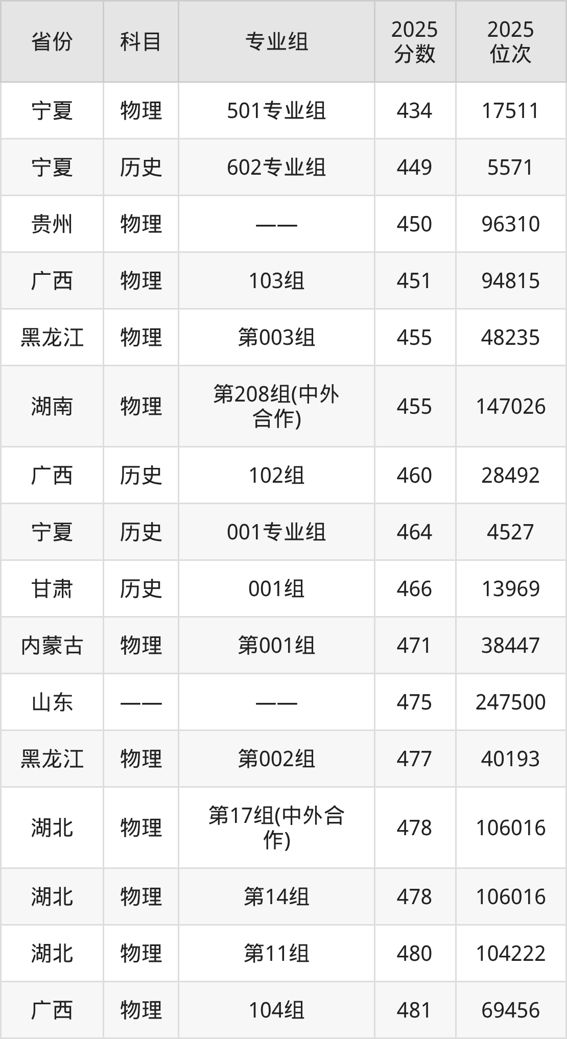历史类:2025年湖北理工学院录取最低分是449分(宁夏),对应的位次排名是5571名。