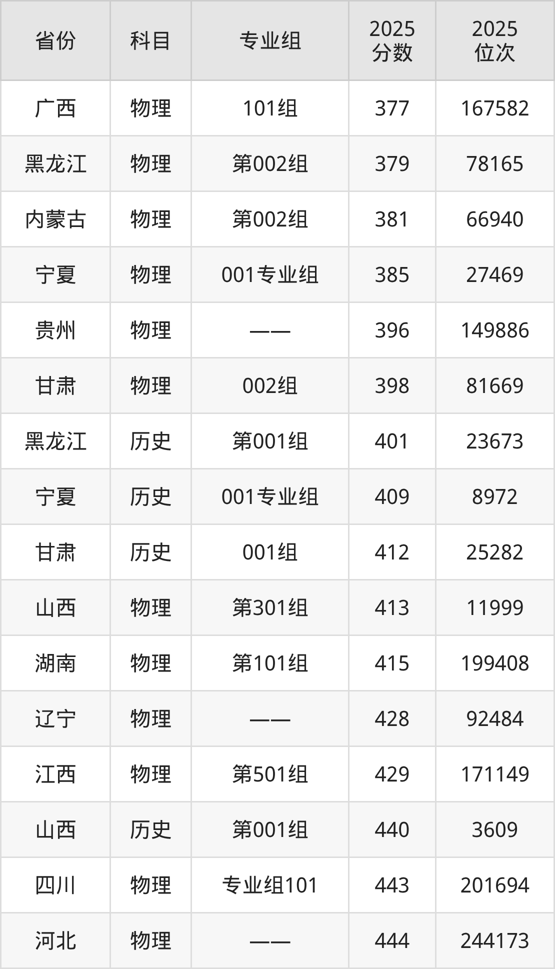 物理类:2025年陕西国防工业职业技术学院录取最低分是377分(广西),对应的位次排名是167582名。