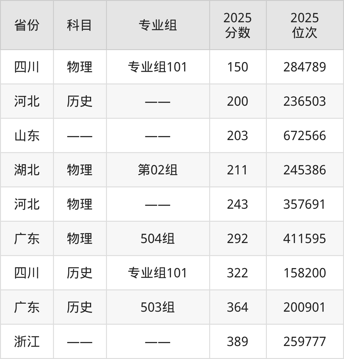 物理类:2025年湖南电子科技职业学院录取最低分是150分(四川),对应的位次排名是284789名。