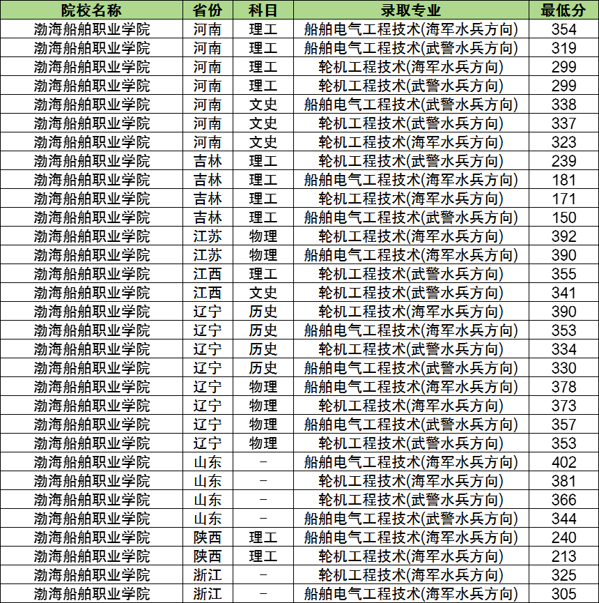 渤海船舶职业学院作为辽宁省内士官直招学校之一,很多同学关心渤海船舶职业学院士官多少分才能录取,以及渤海船舶职业学院直招军士有哪些专业等。直招士官也叫直招军士,本期将介绍渤海船舶职业学院直招军士的各省各专业分数线。