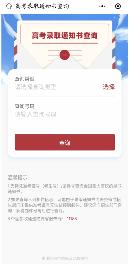 支付宝查询:进入其生活号中的“EMS中国邮政速递物流”,点击“我想查询”找到高考通知书查询的入口。