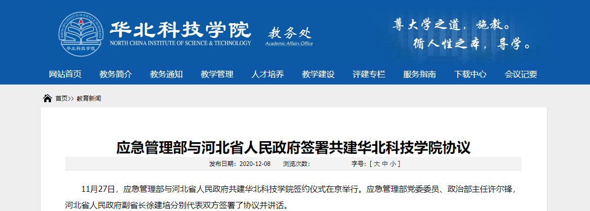 2020年11月27日,应急管理部与河北省人民政府共建华北科技学院签约仪式在北京举行。河北省人民政府表示将支持学院提升办学层次,尽早建成高水平应急管理大学。