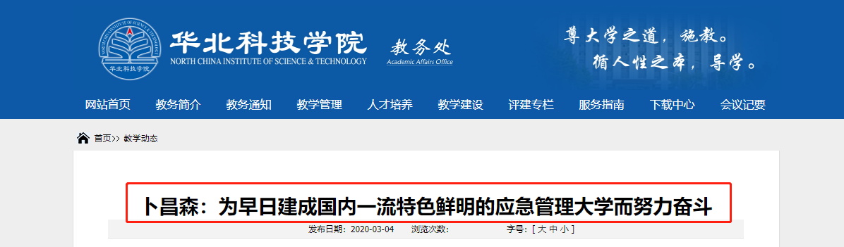 2020年2月28日,华北科技学院召开了党委全委会。会上,党委书记卜昌森就号召干部师生勇做应急管理大学的奠基人和开路先锋,抓住应急管理事业发展的政策红利,为早日建成国内一流特色鲜明的应急管理大学而努力奋斗。