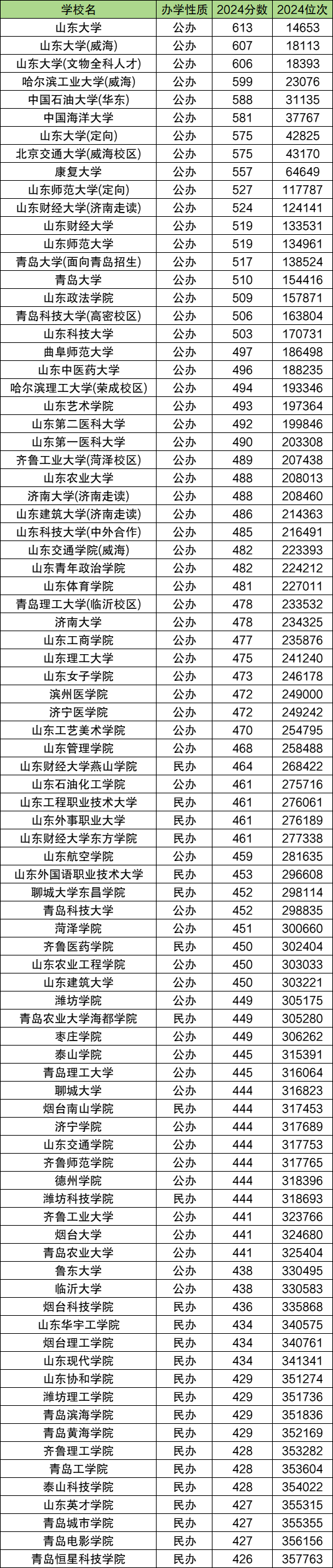 篇幅有限,下表展示的是2024年山东省内所有本科大学录取分数线及位次排名: