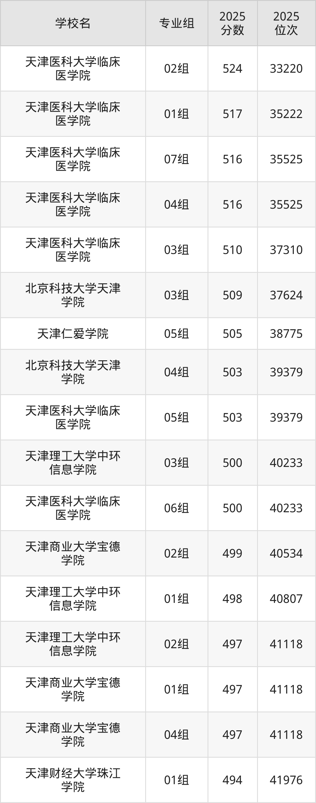 2025年一共有9所民办本科在天津招生,包含了34个专业组,录取分数线从476分到524分不等,对应最低位次从47173名到33220名。下面分别展示天津市分数线最高、最低的五个院校专业组。