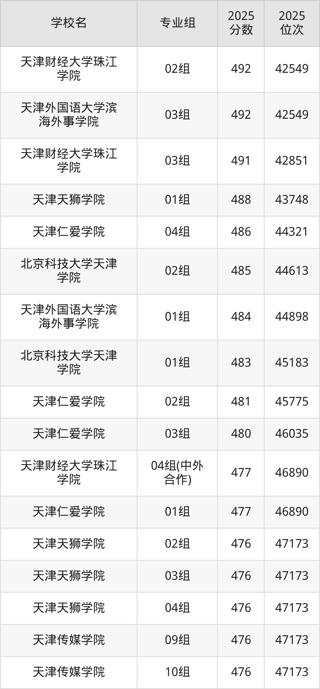 2025年天津民办本科最低录取分数线是476分,收分最低的学校为天津天狮学院02组。