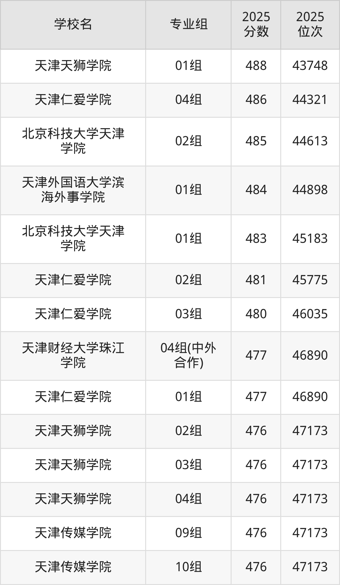 (2)天津天狮学院03组:476分、47173名;