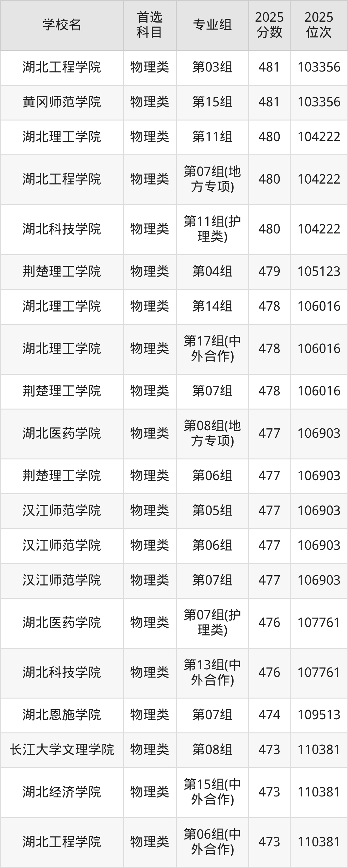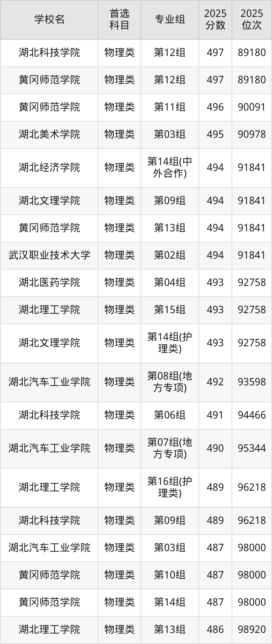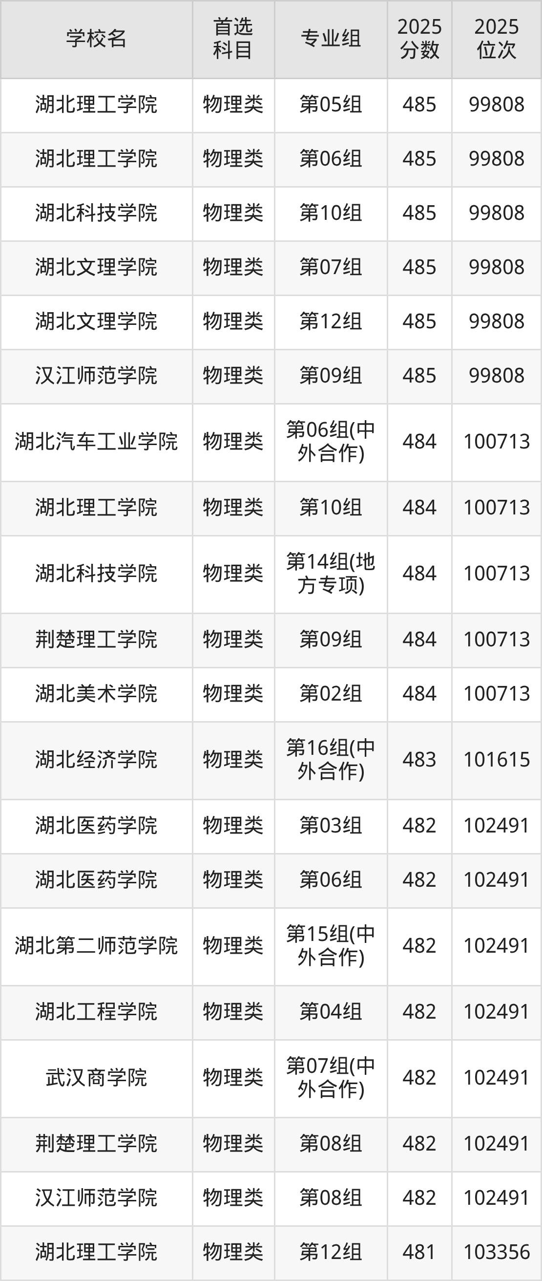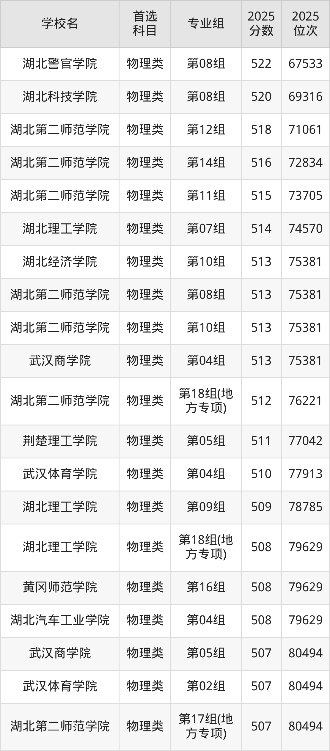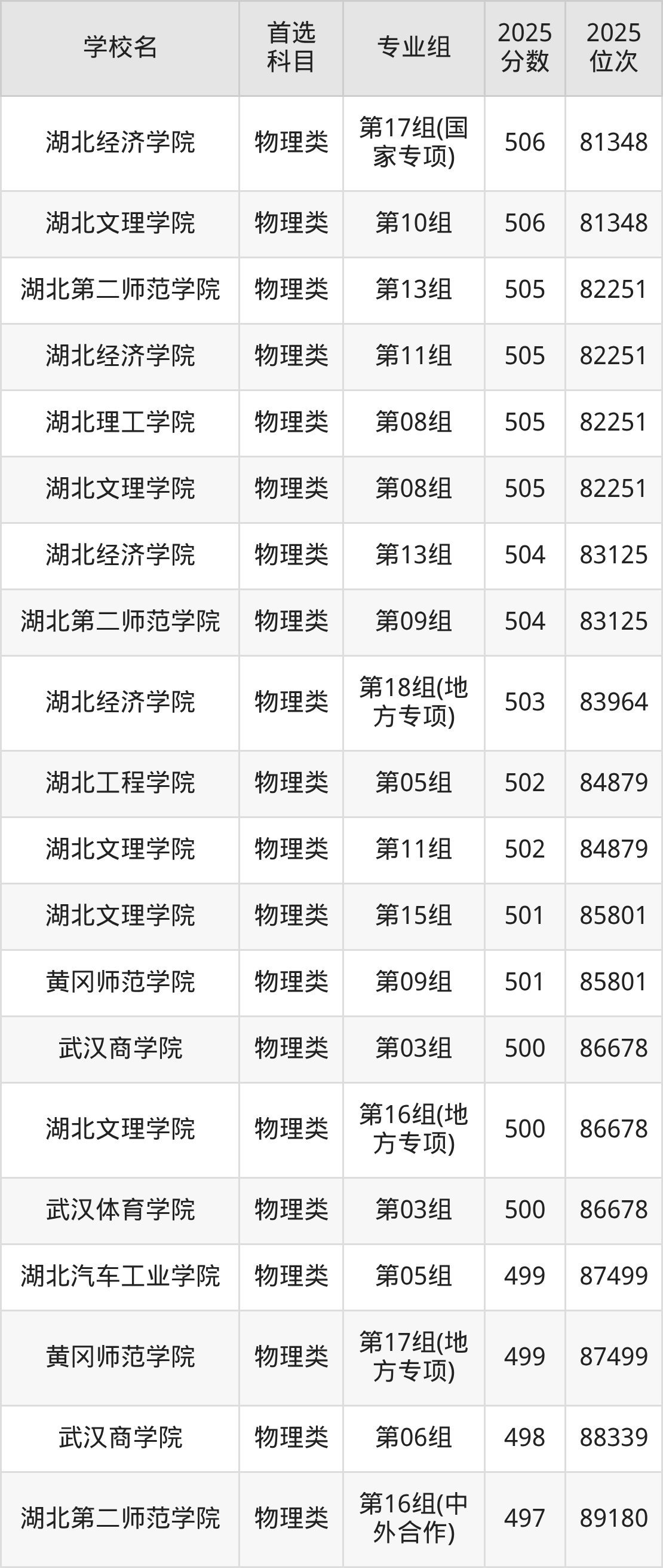 2025年一共有48所二本大学在湖北物理类招生,包含了210个专业组,录取分数线从426分到534分不等,对应最低位次从148657名到57289名。下面分别展示湖北省分数线最高、最低的五个院校专业组。