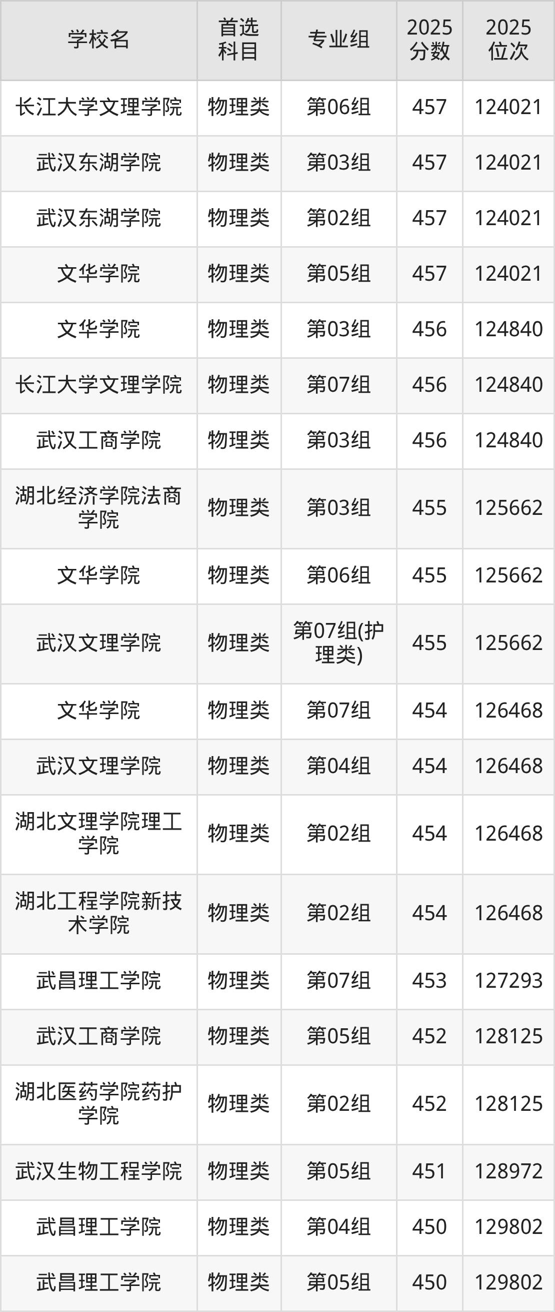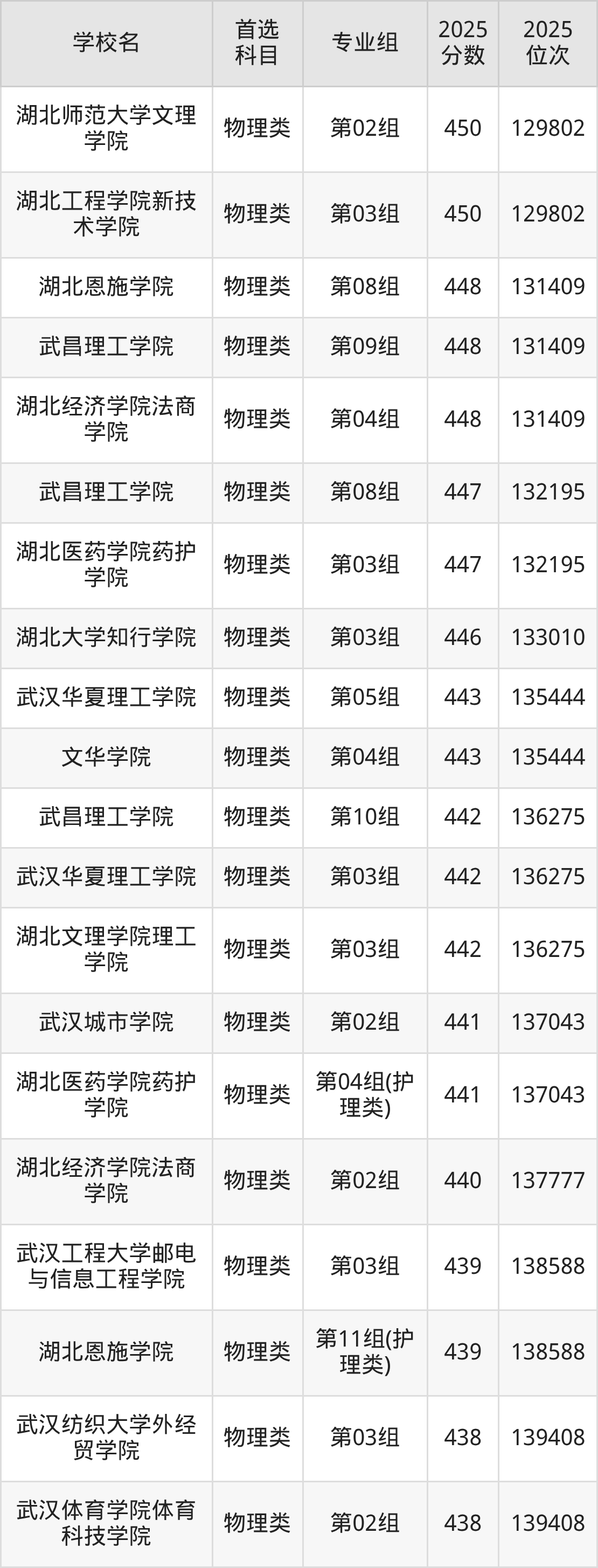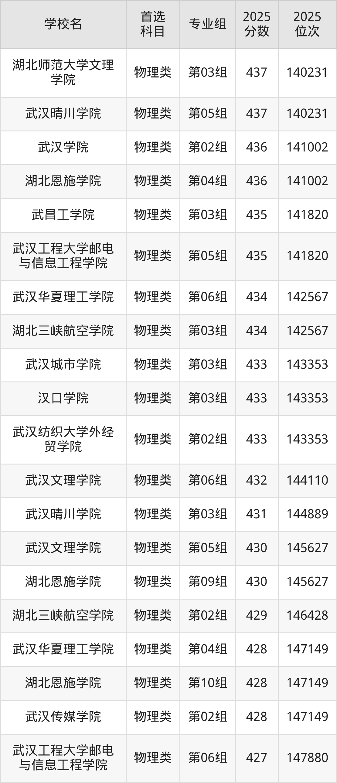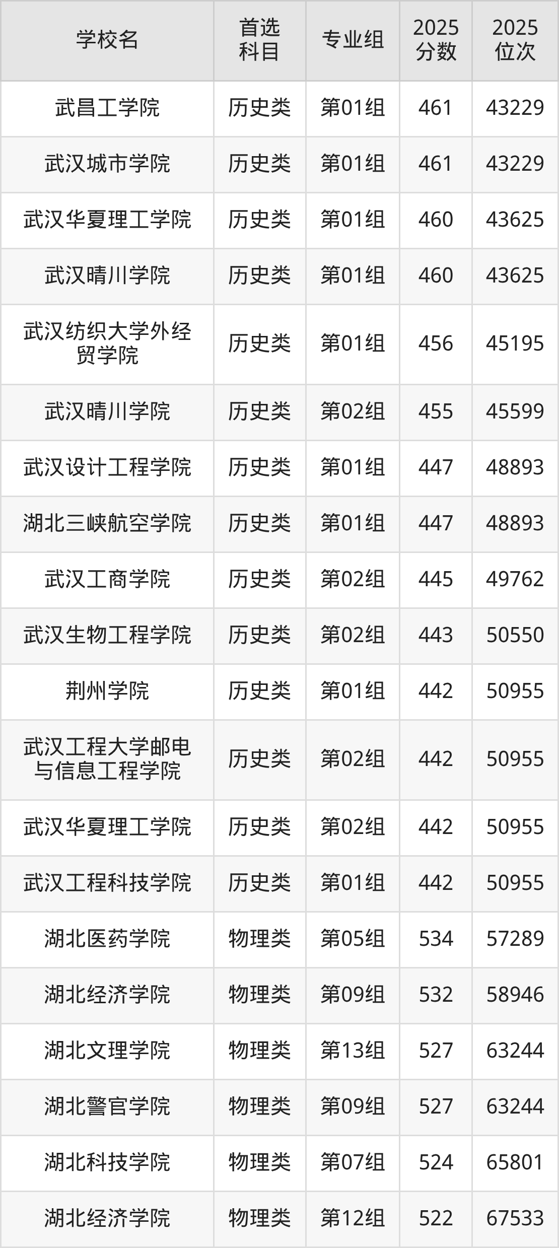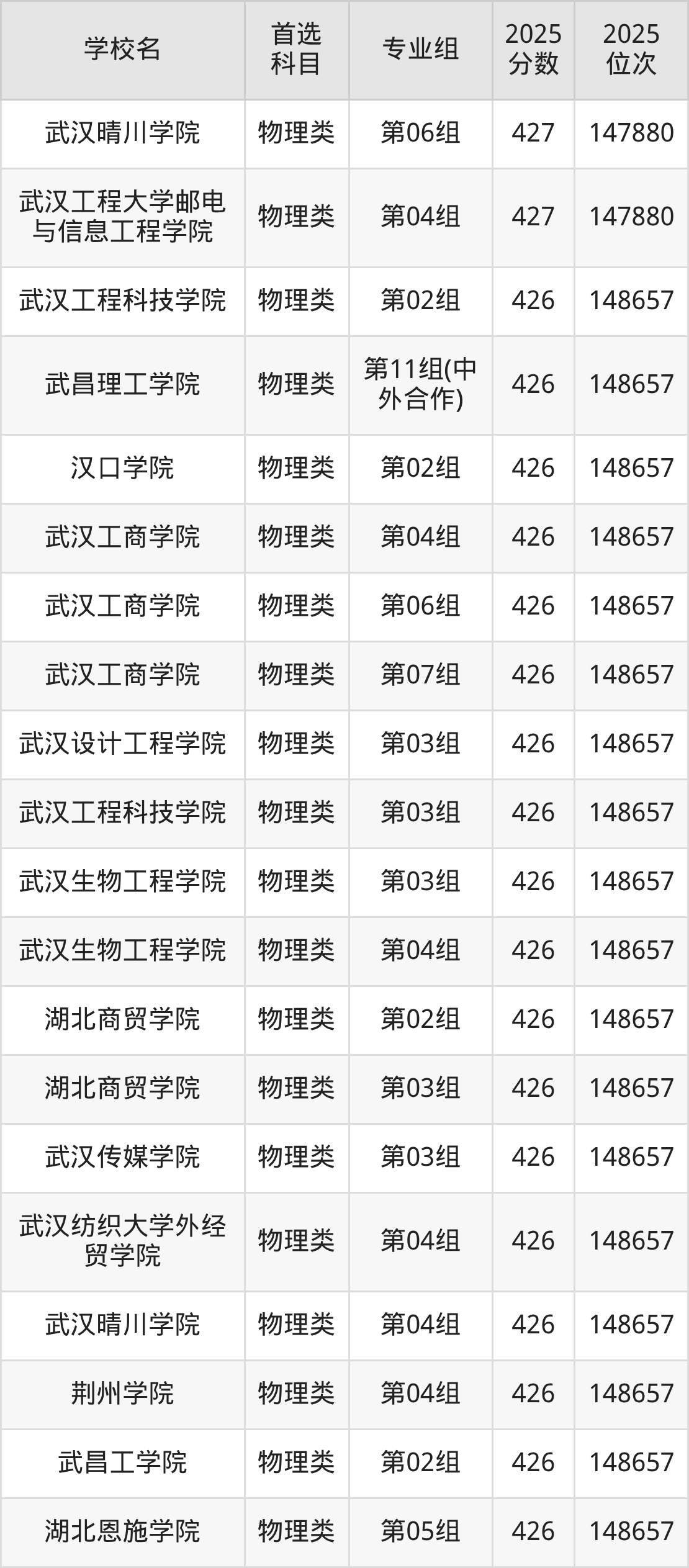 2025年湖北二本大学最低录取分数线是426分,收分最低的学校为武汉工程科技学院第02组。