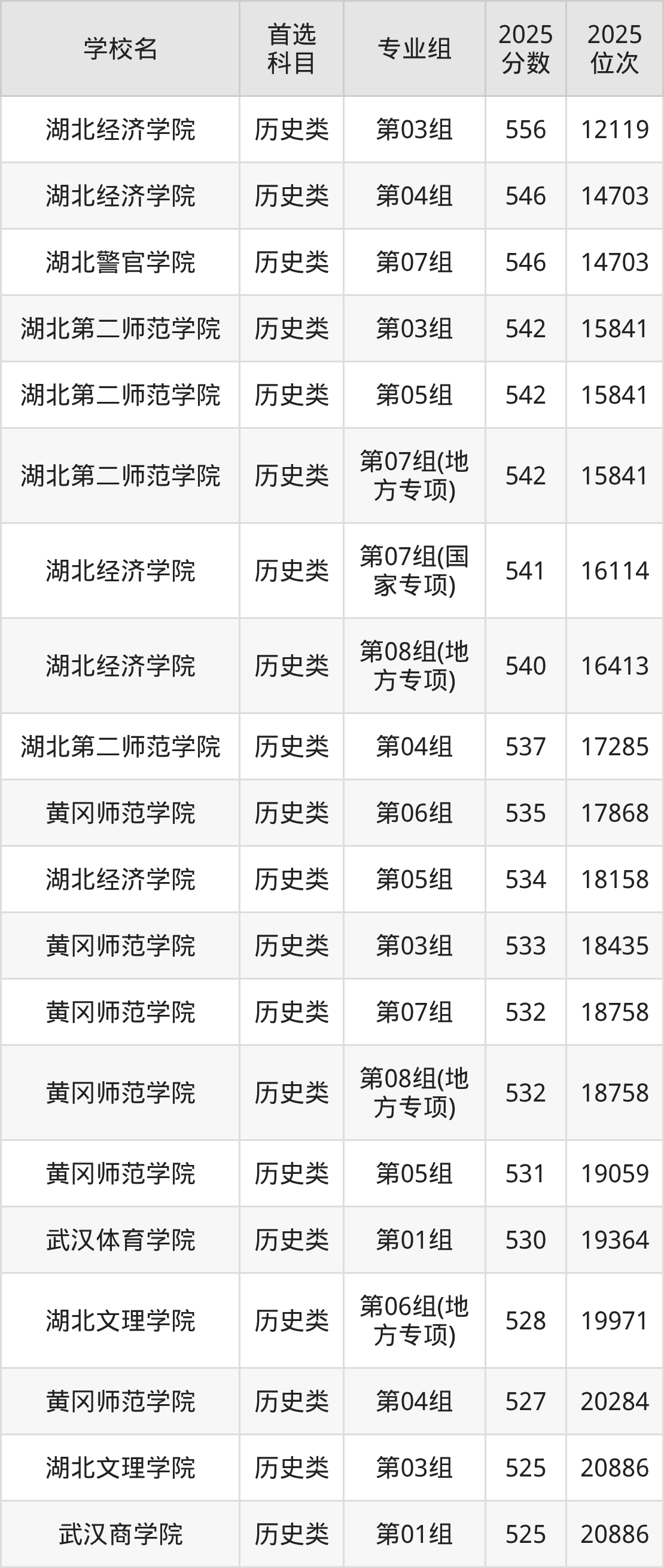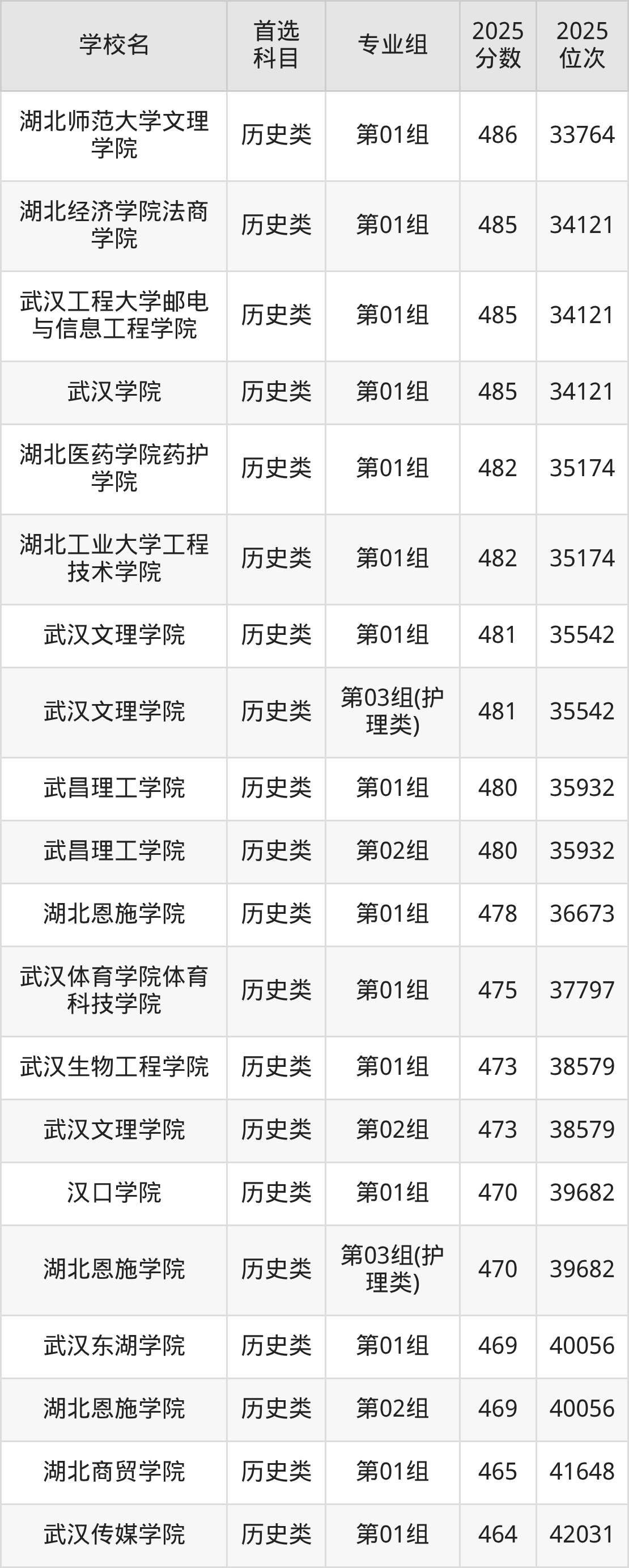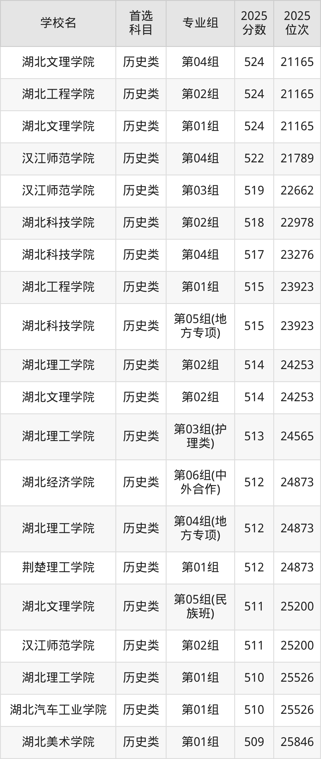 2025年一共有48所二本大学在湖北历史类招生,包含了94个专业组,录取分数线从442分到556分不等,对应最低位次从50955名到12119名。下面分别展示湖北省分数线最高、最低的五个院校专业组。