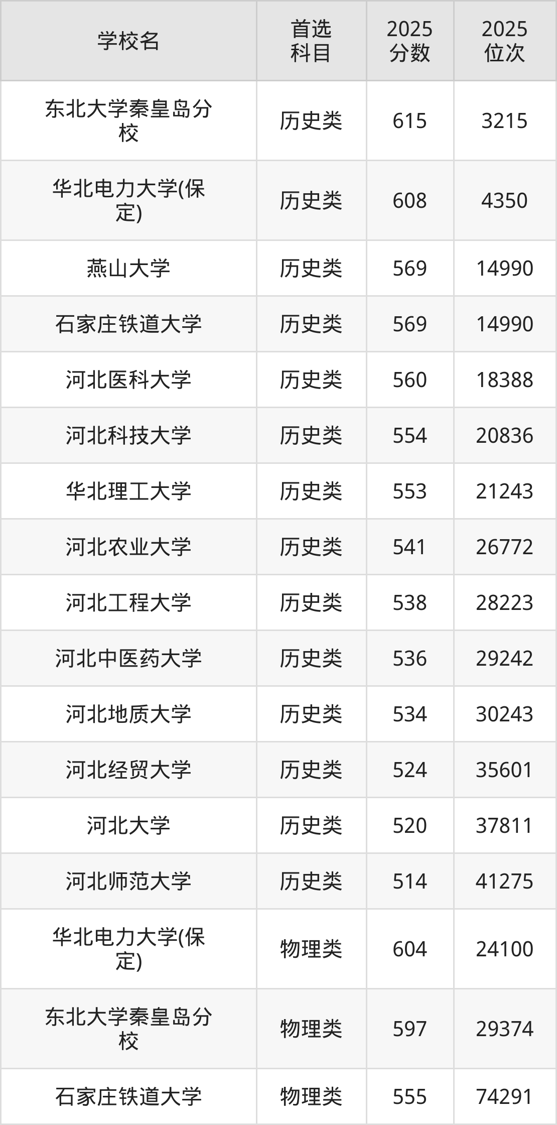2025年一共有14所一本大学在河北历史类招生,录取分数线从514分到615分不等,对应最低位次从41275名到3215名。下面分别展示河北省分数线最高、最低的五个院校。
