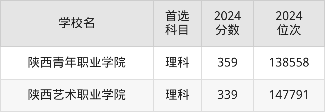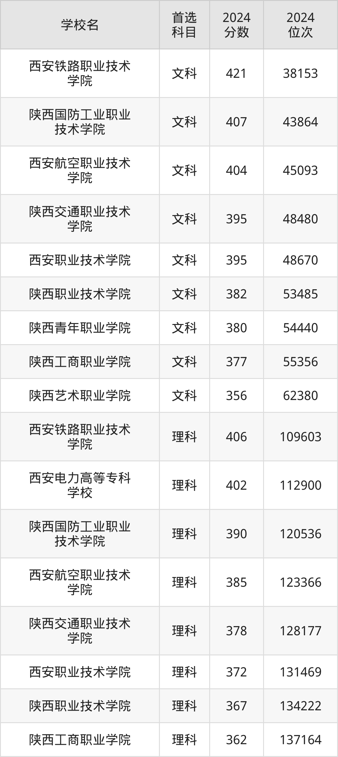 2024年一共有9所公办大专在西安文科招生,录取分数线从356分到421分不等,对应最低位次从62380名到38153名。下面分别展示西安市分数线最低的五个院校。