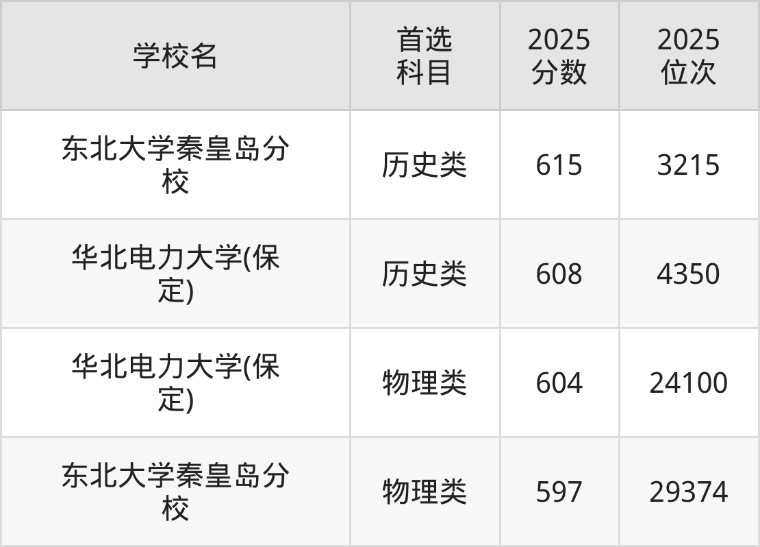 2025年一共有2所211在河北历史类招生,录取分数线从608分到615分不等,对应最低位次从4350名到3215名。