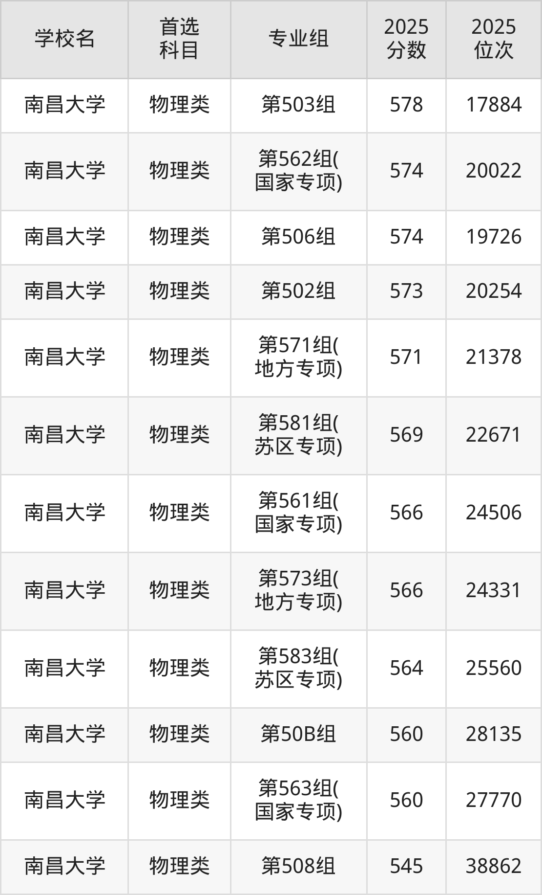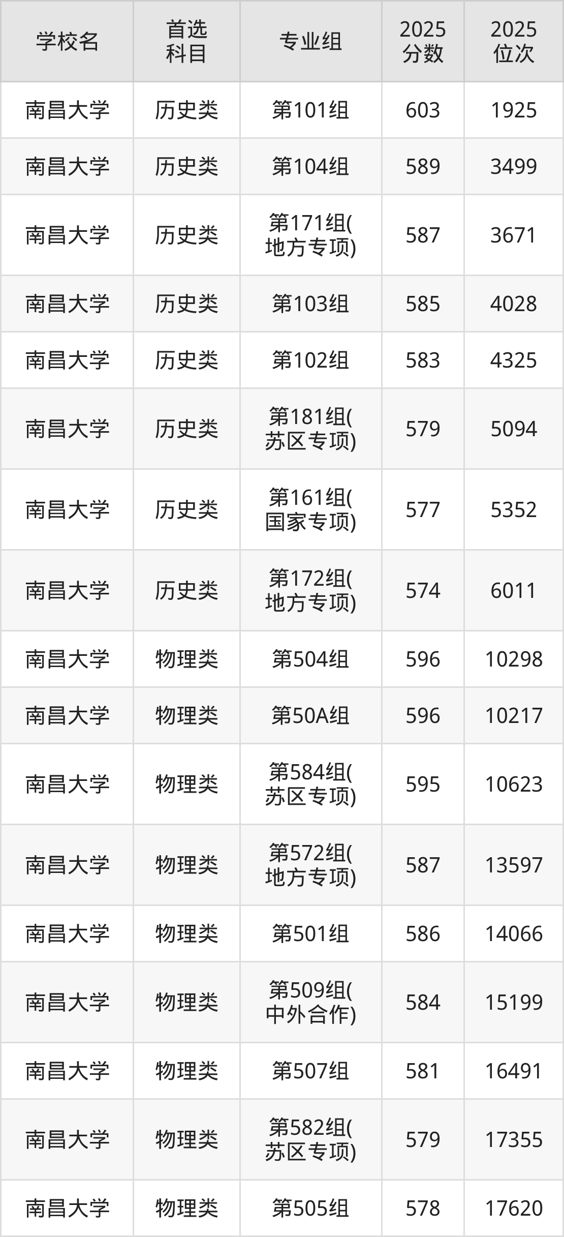 2025年一共有1所211在南昌历史类招生,包含了8个专业组,录取分数线从574分到603分不等,对应最低位次从6011名到1925名。下面分别展示南昌市分数线最低的五个院校专业组。