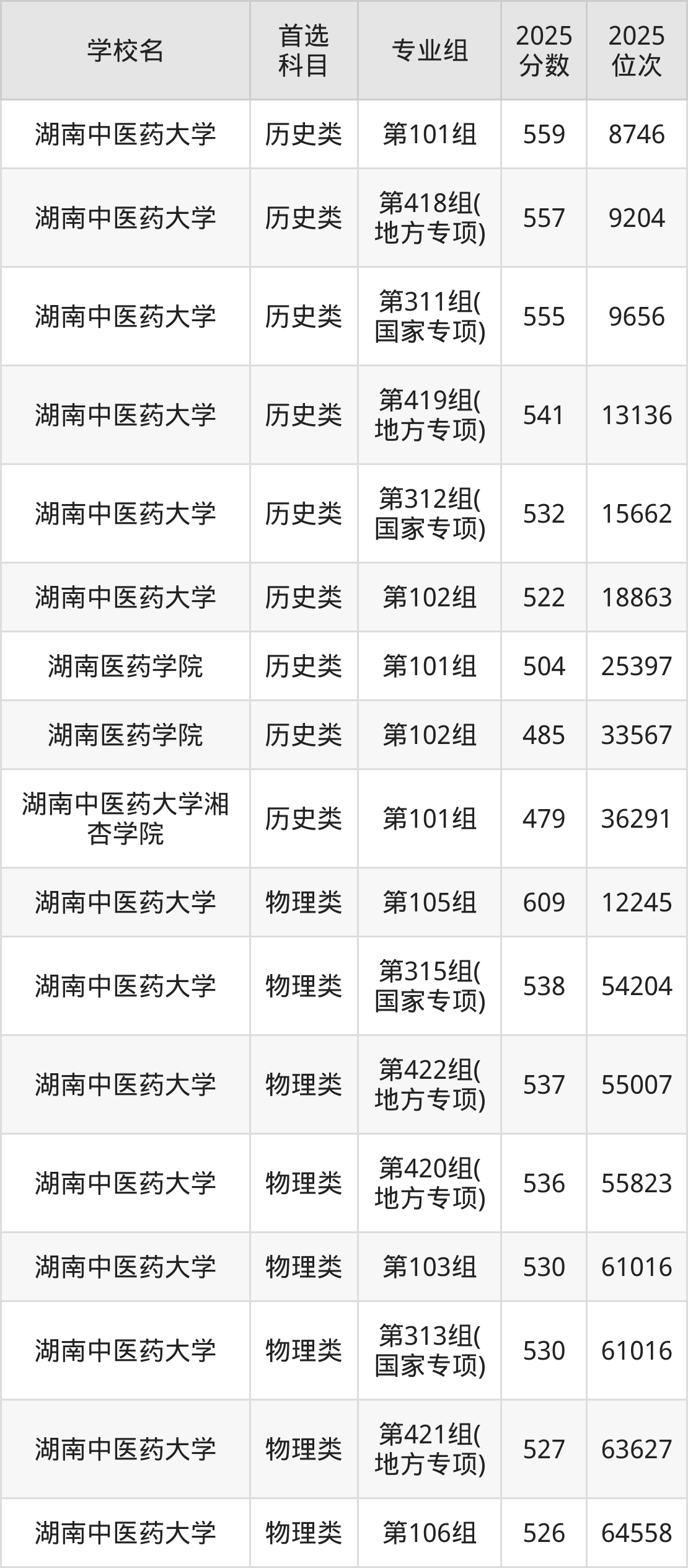 2025年一共有3所医科大学在湖南历史类招生,包含了9个专业组,录取分数线从479分到559分不等,对应最低位次从36291名到8746名。下面分别展示湖南省分数线最低的五个院校专业组。
