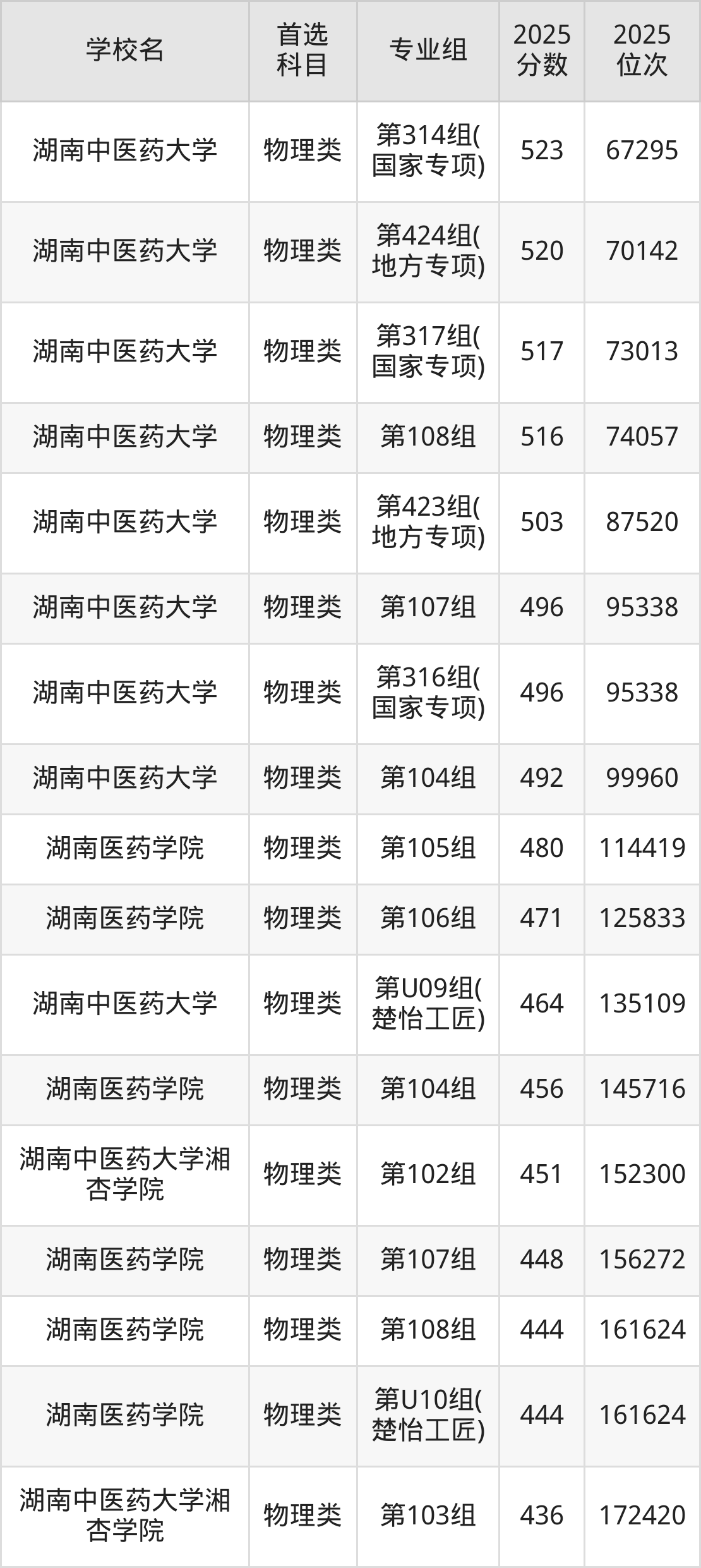 2025年一共有3所医科大学在湖南物理类招生,包含了25个专业组,录取分数线从436分到609分不等,对应最低位次从172420名到12245名。下面分别展示湖南省分数线最高、最低的五个院校专业组。