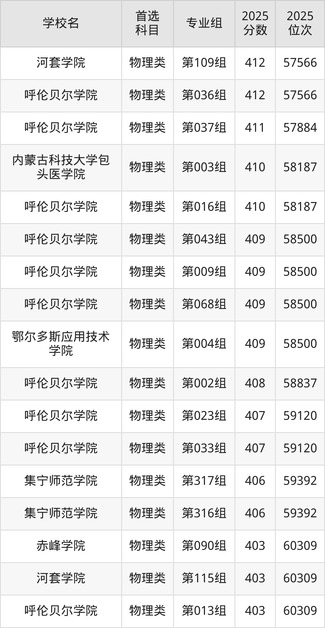 2025年一共有14所二本大学在内蒙古物理类招生,包含了125个专业组,录取分数线从375分到539分不等,对应最低位次从68528名到19077名。下面分别展示内蒙古自治区分数线最高、最低的五个院校专业组。
