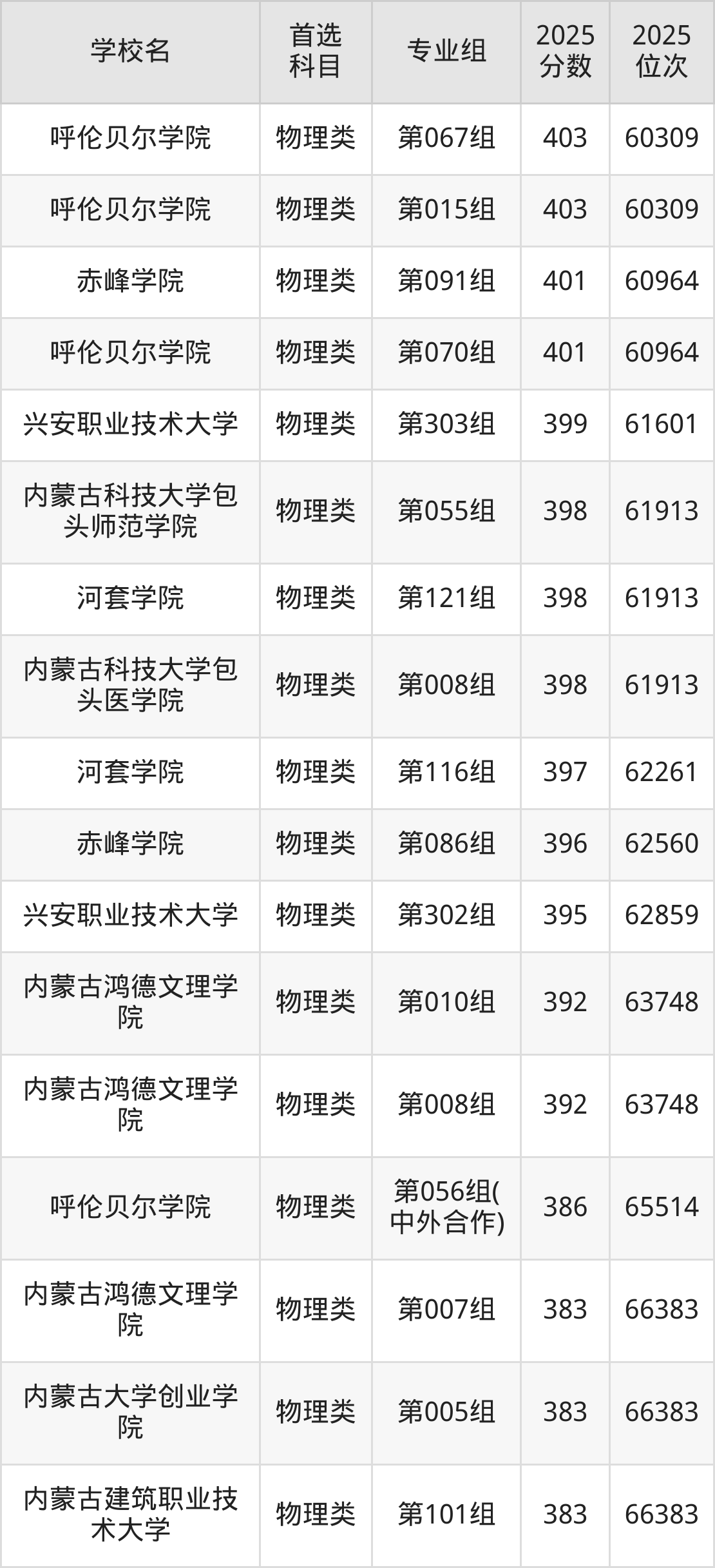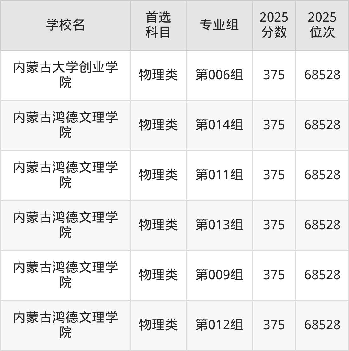 2025年内蒙古二本大学最低录取分数线是375分,收分最低的学校为内蒙古大学创业学院第006组。