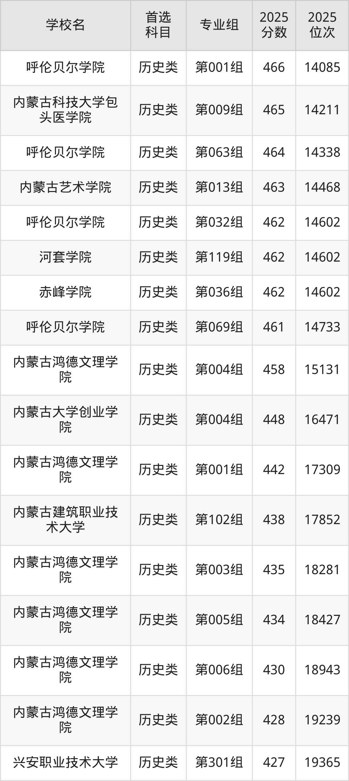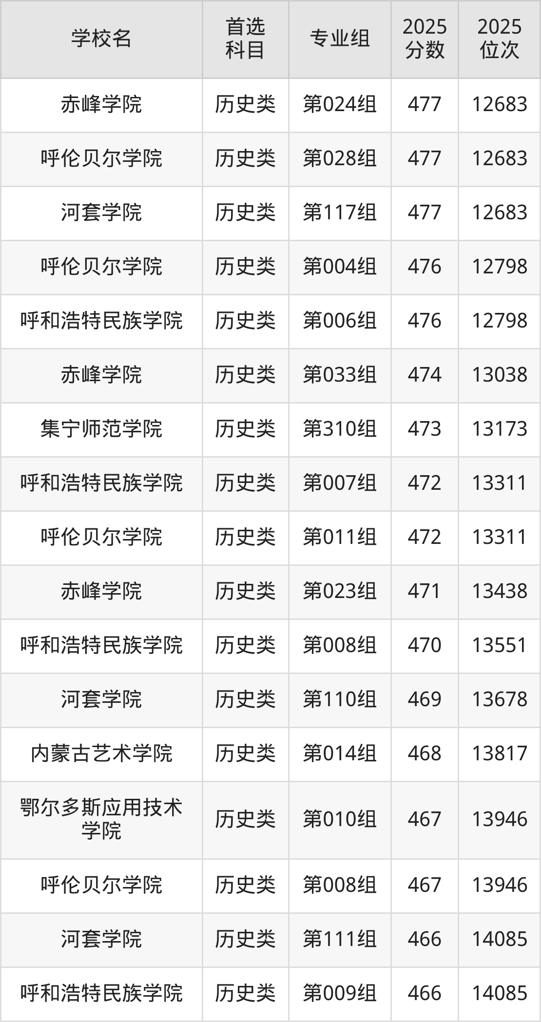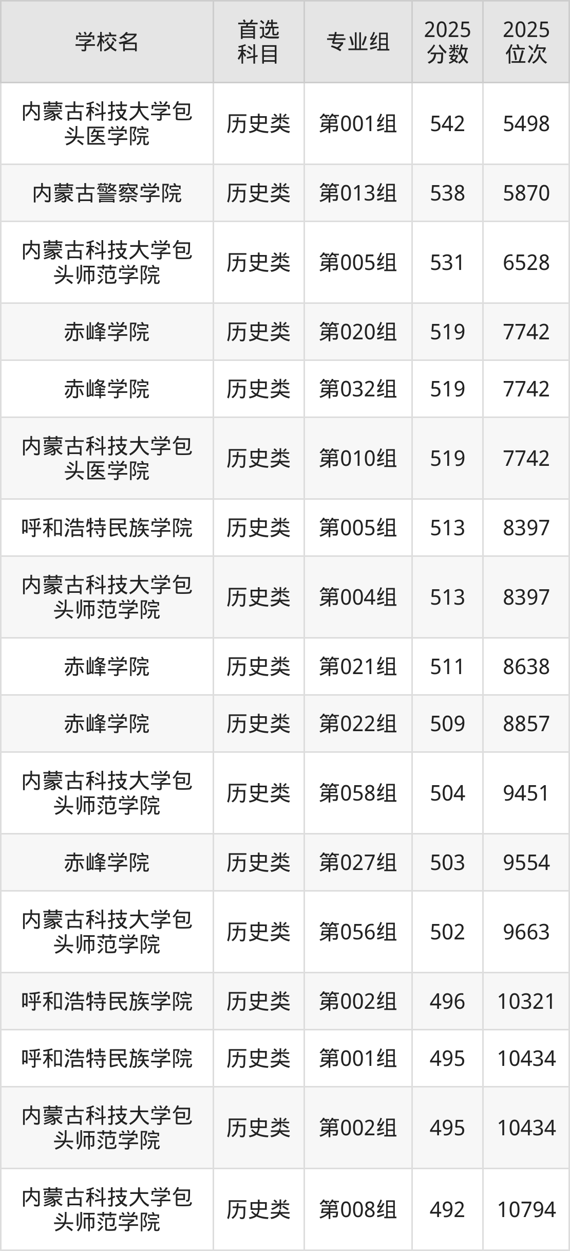 2025年一共有14所二本大学在内蒙古历史类招生,包含了68个专业组,录取分数线从427分到542分不等,对应最低位次从19365名到5498名。下面分别展示内蒙古自治区分数线最高、最低的五个院校专业组。
