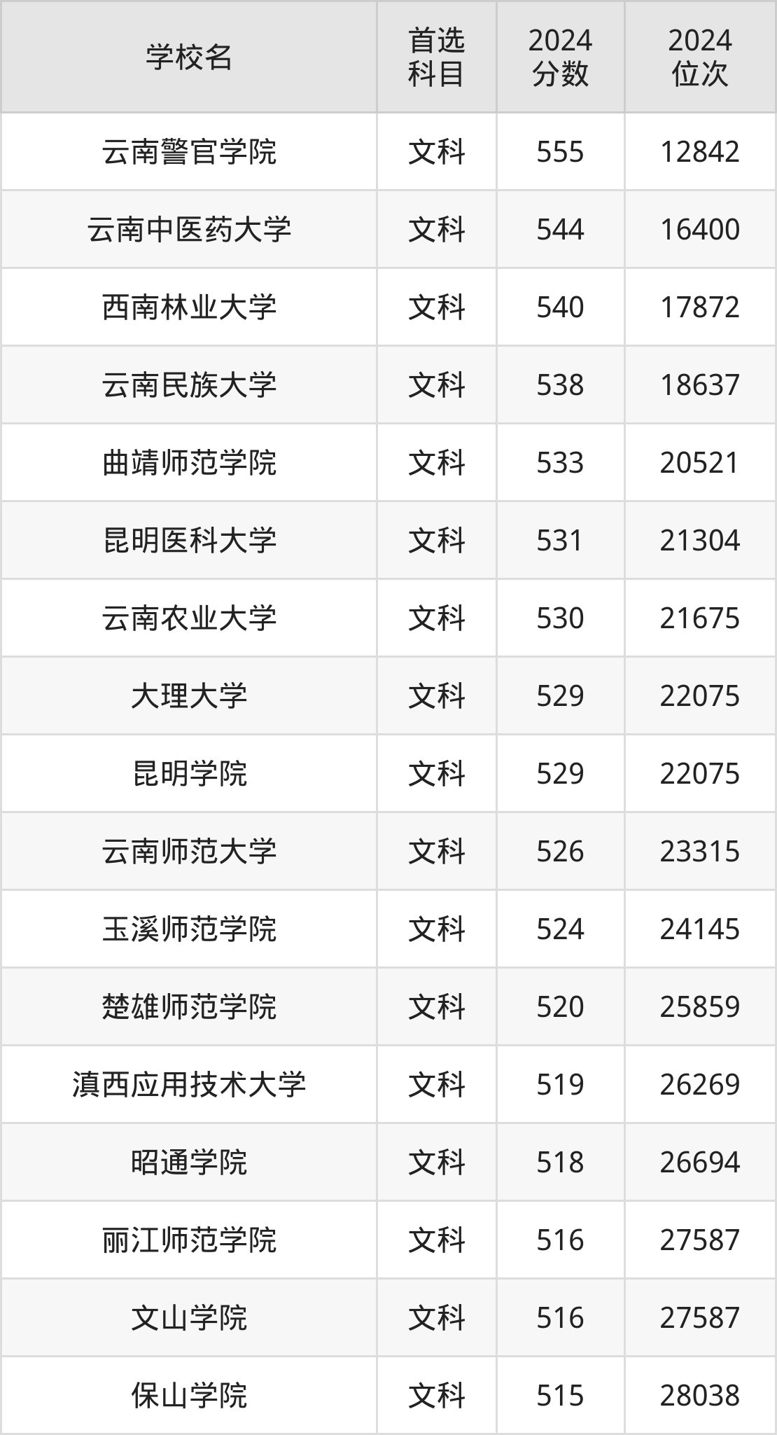 2024年一共有21所公办二本大学在云南文科招生,录取分数线从508分到555分不等,对应最低位次从31228名到12842名。下面分别展示云南省分数线最高、最低的五个院校。