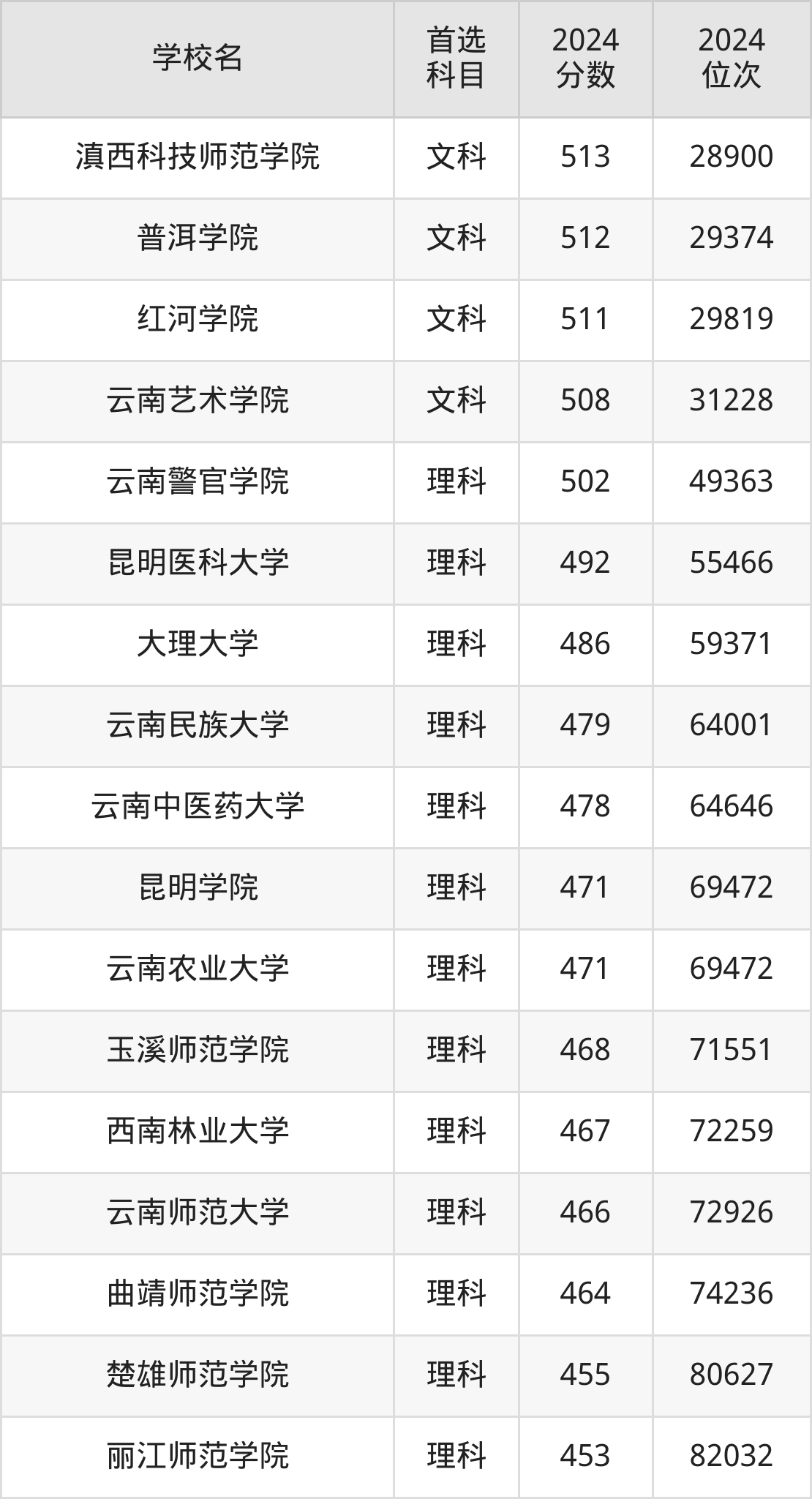 2024年云南本科批次线文科480分、理科420分。因此云南考生如果想留在省内读公办二本大学的话,文科考生至少需要过线28分、而理科考生至少需要过线20分。
