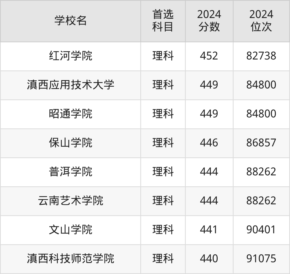 2024年云南公办二本大学最低录取分数线是440分,收分最低的学校为滇西科技师范学院。