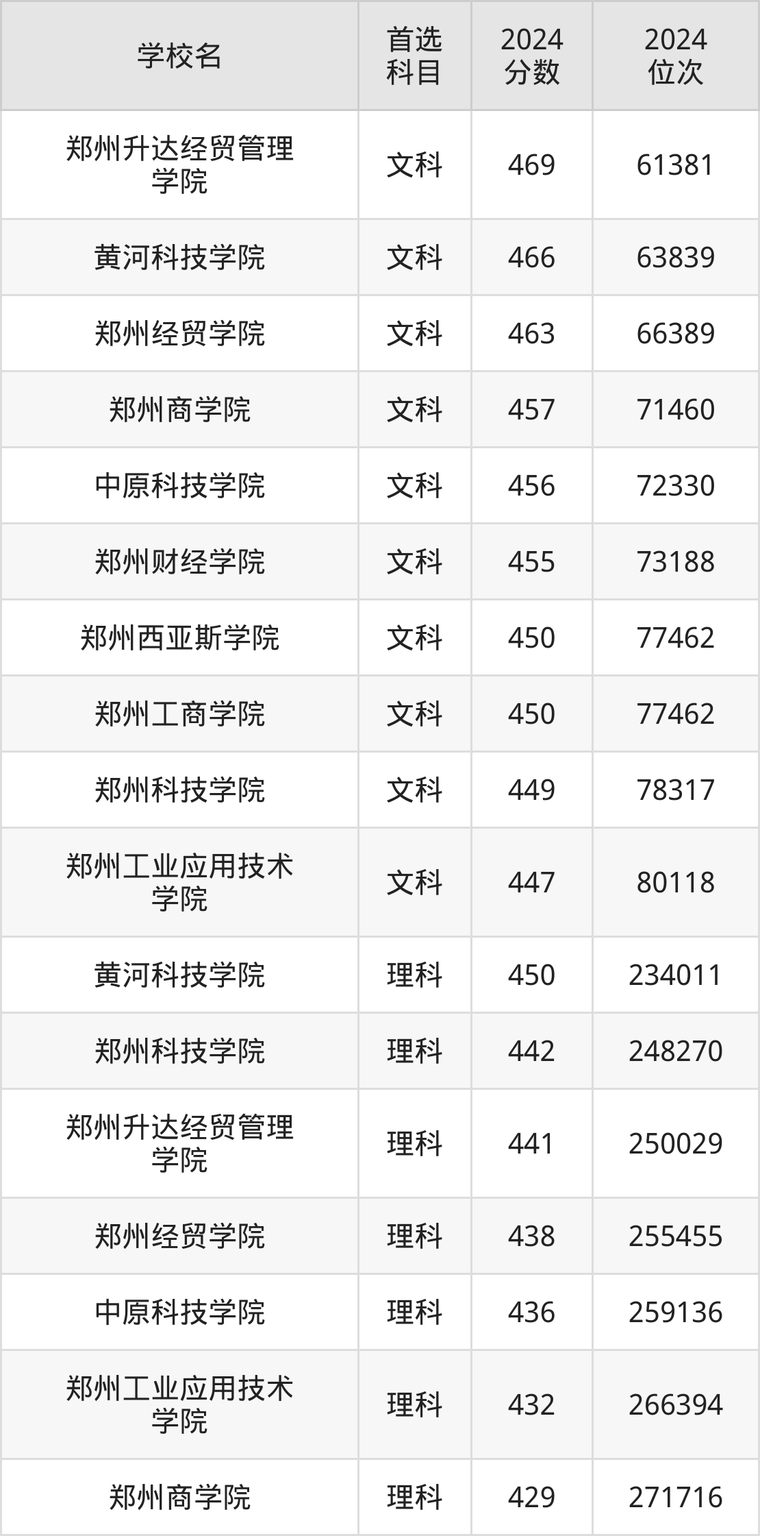 2024年郑州市民办二本录取分数线一览表完整版,请查看: