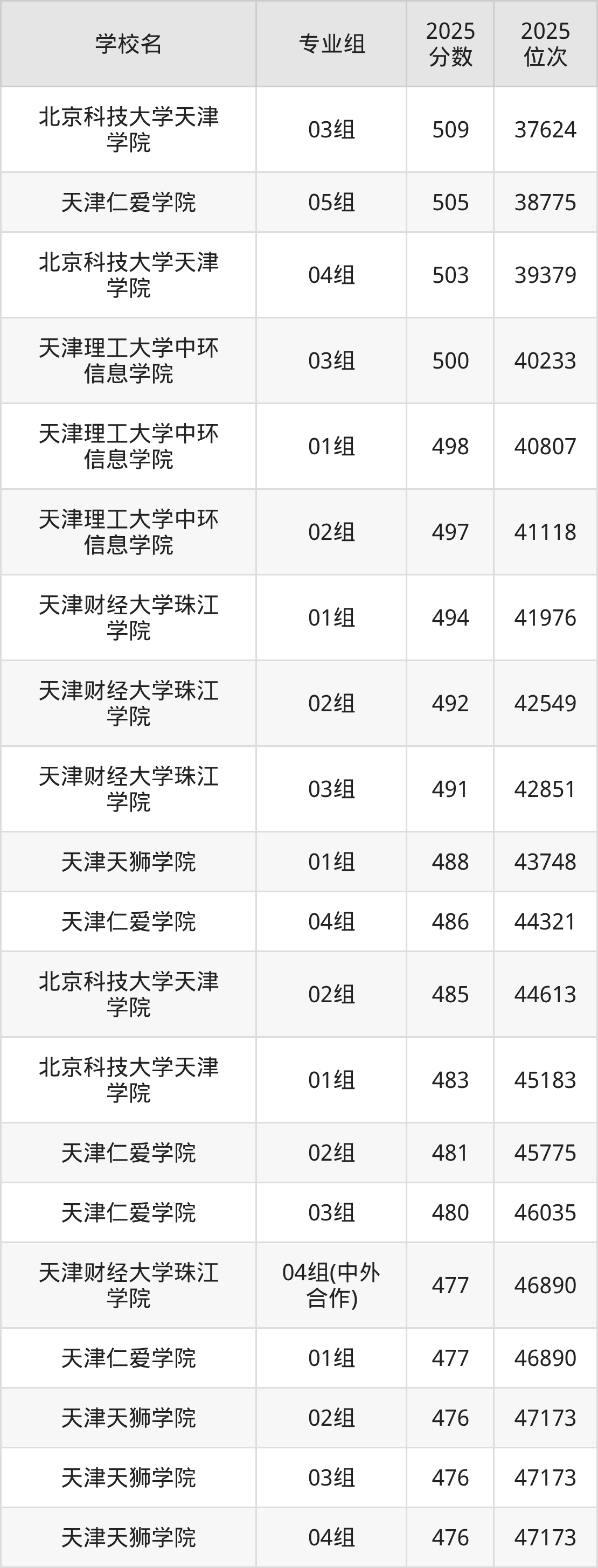 2025年一共有5所二本综合大学在天津招生,包含了20个专业组,录取分数线从476分到509分不等,对应最低位次从47173名到37624名。下面分别展示天津市分数线最高、最低的五个院校专业组。