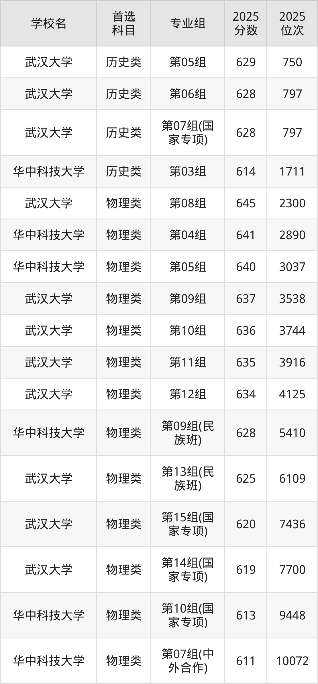2025年一共有2所985在武汉历史类招生,包含了4个专业组,录取分数线从614分到629分不等,对应最低位次从1711名到750名。
