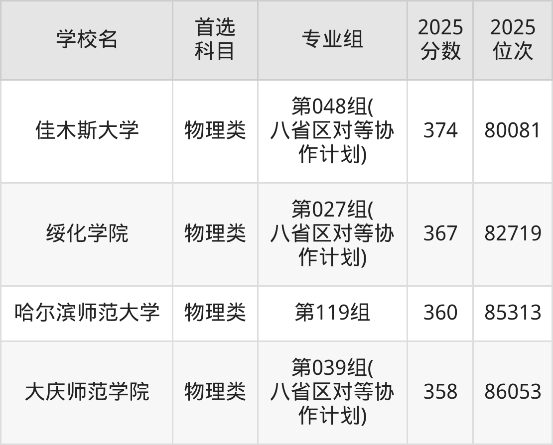 (2)佳木斯大学第048组(八省区对等协作计划):374分、80081名;