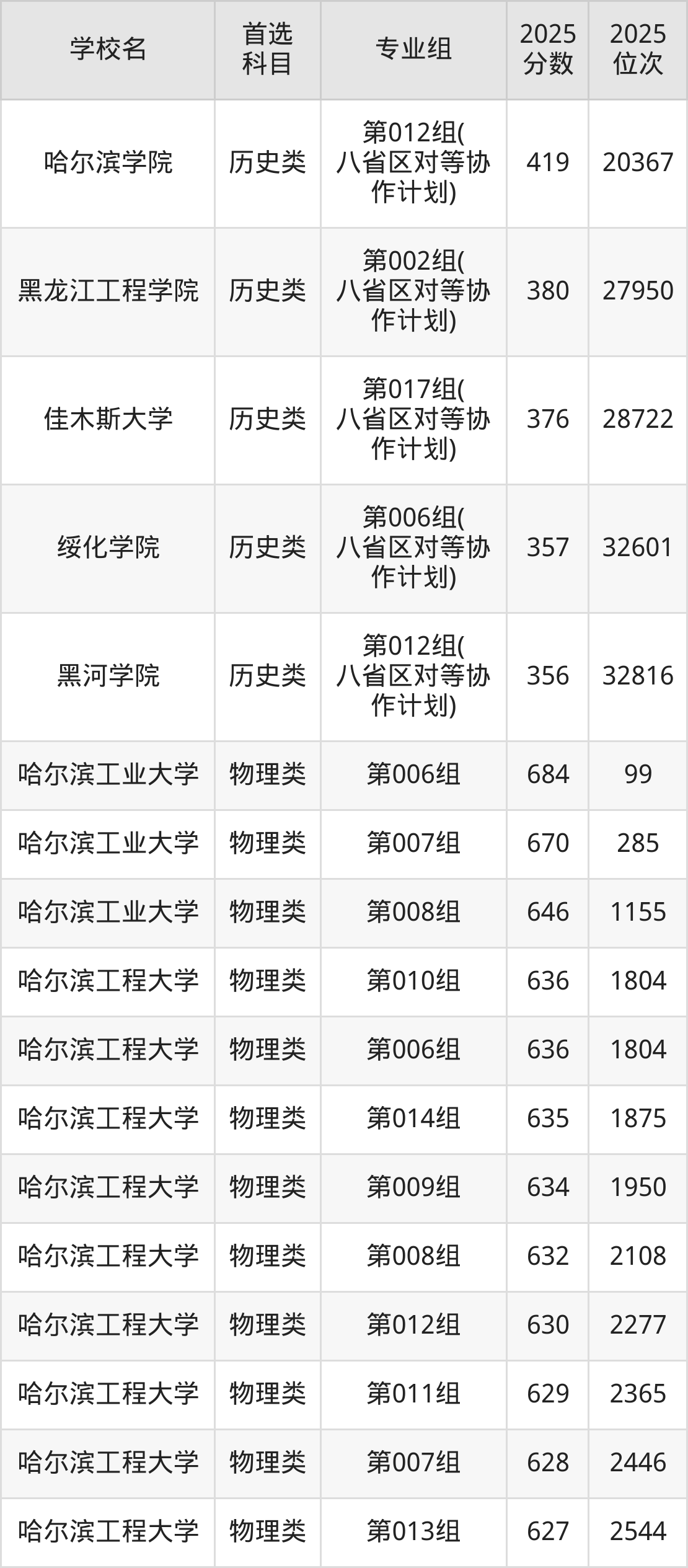 (2)黑龙江工程学院第002组(八省区对等协作计划):380分、27950名;
