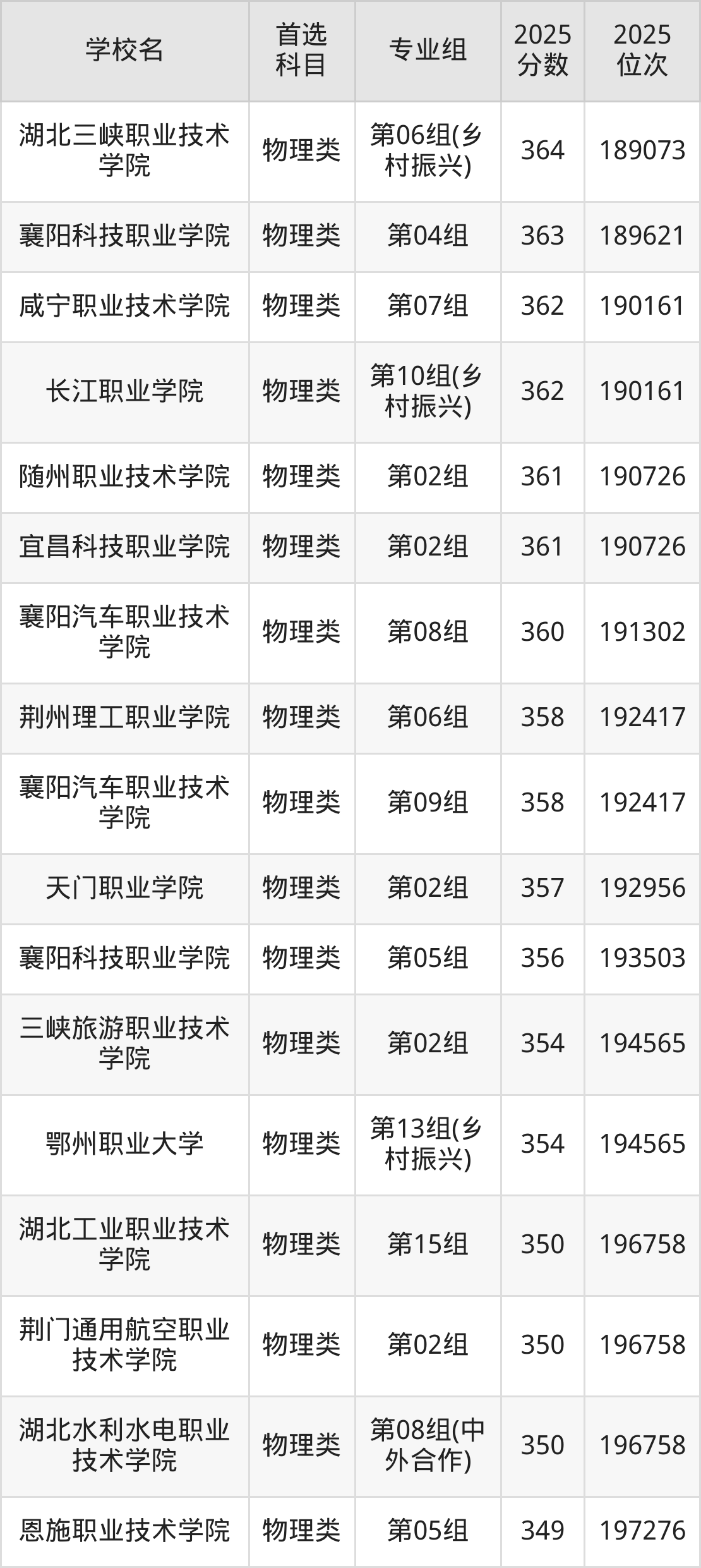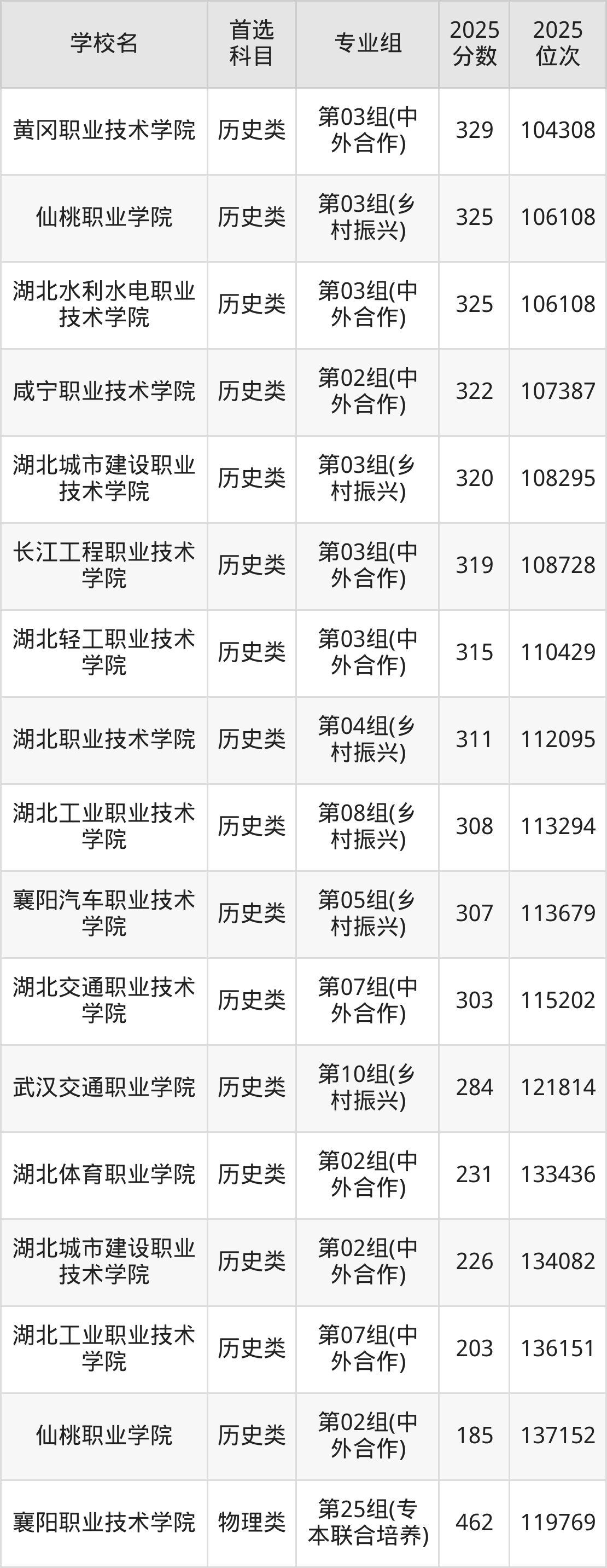 (1)襄阳职业技术学院第25组(专本联合培养):462分、119769名;