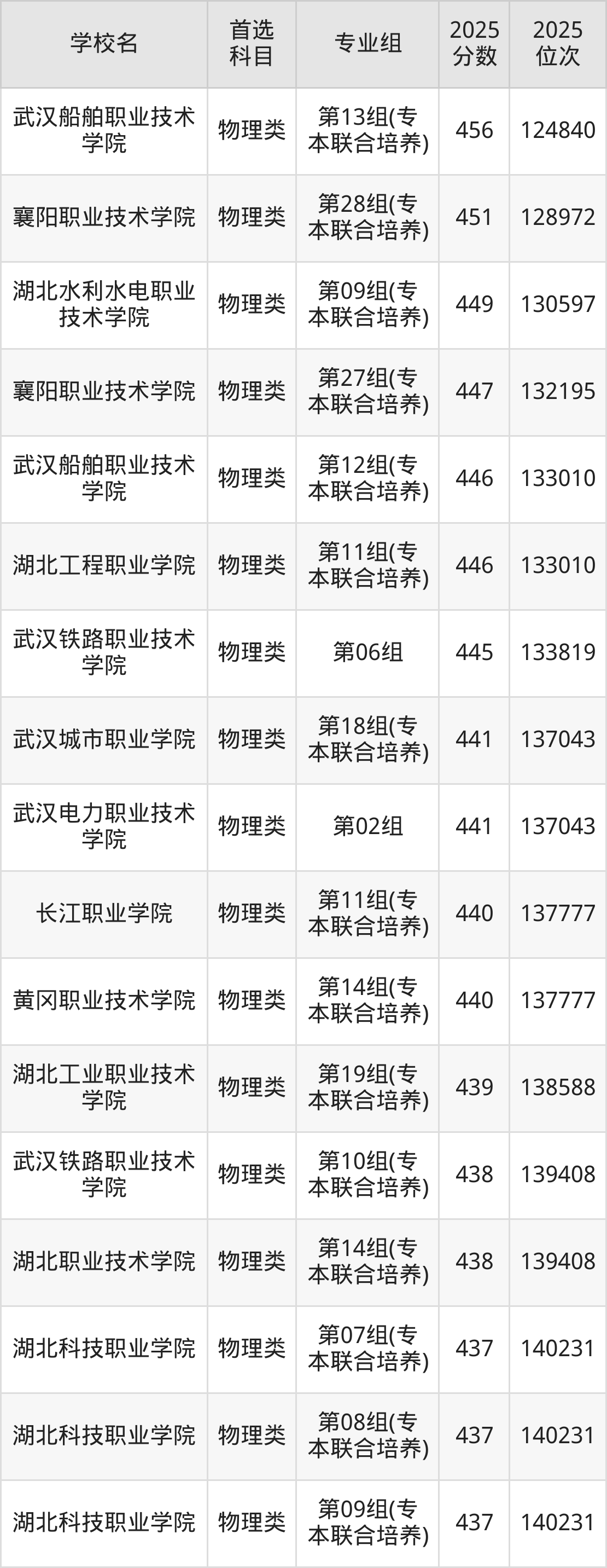 (2)武汉船舶职业技术学院第13组(专本联合培养):456分、124840名;