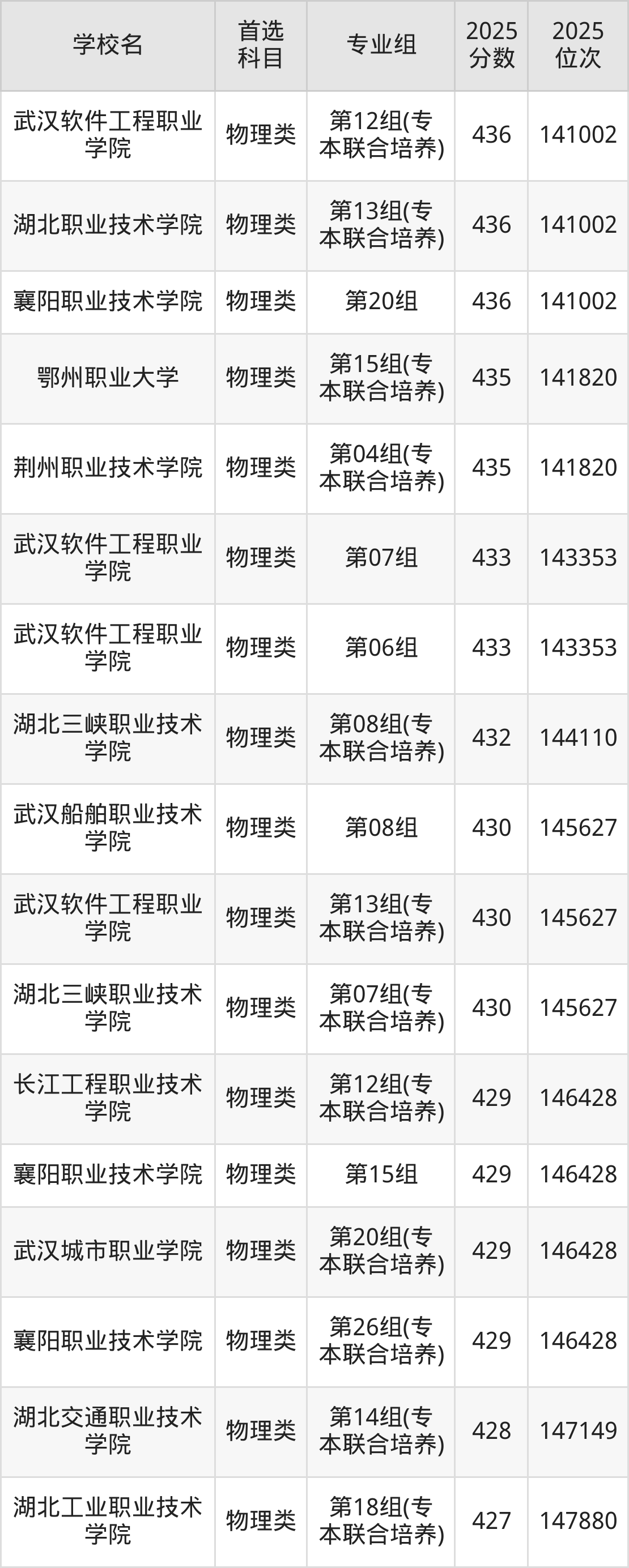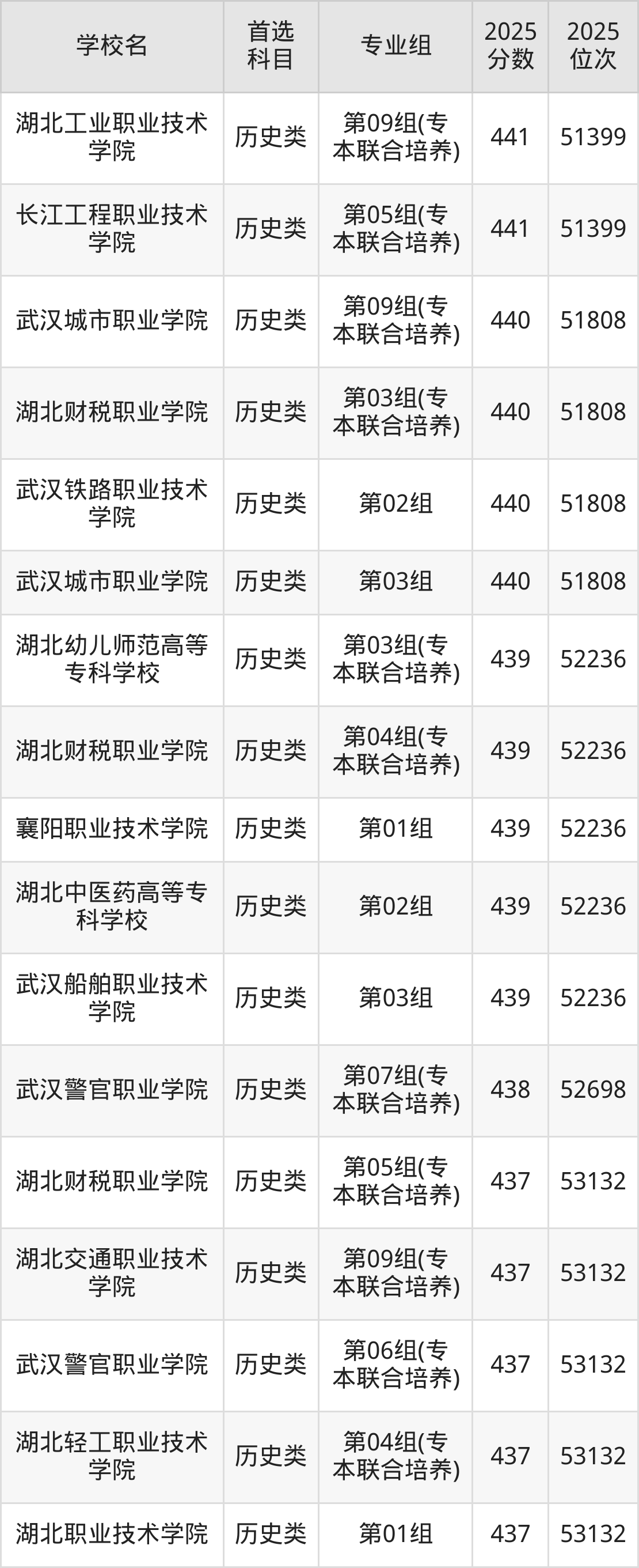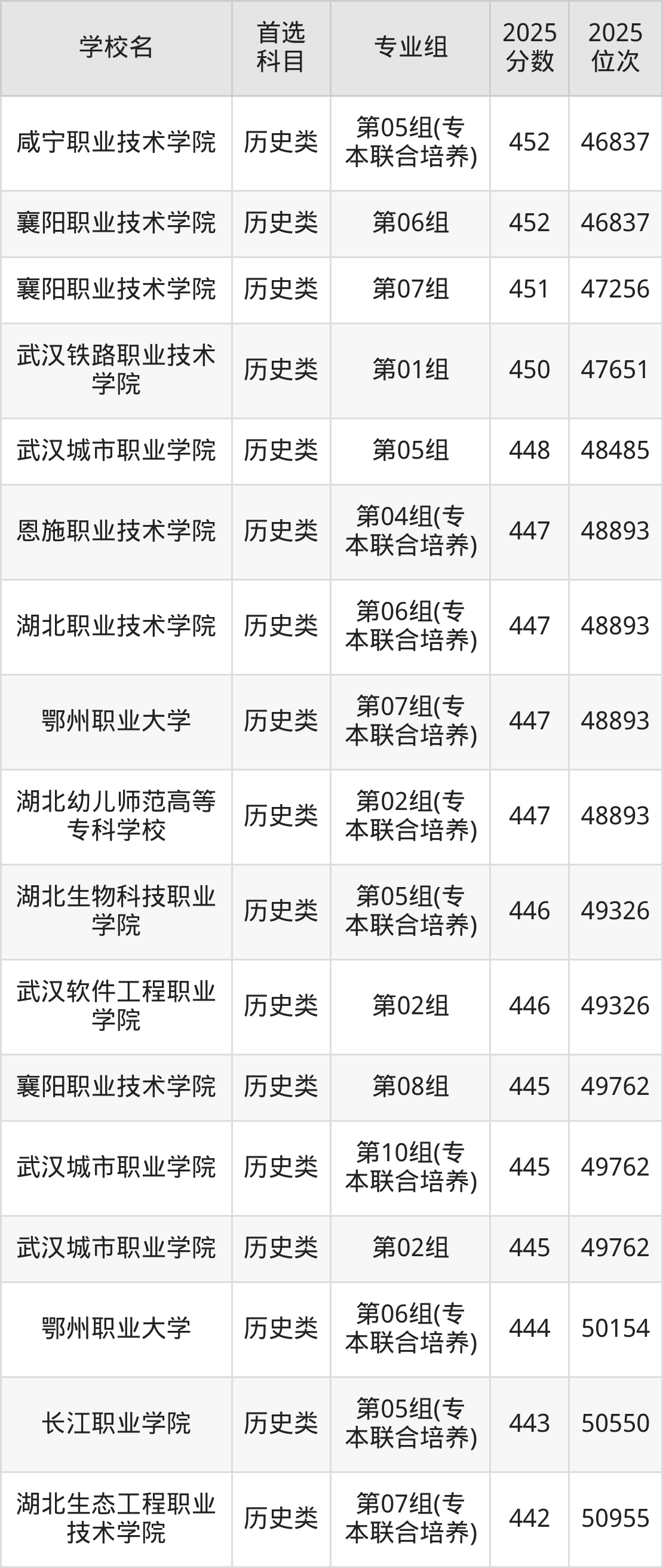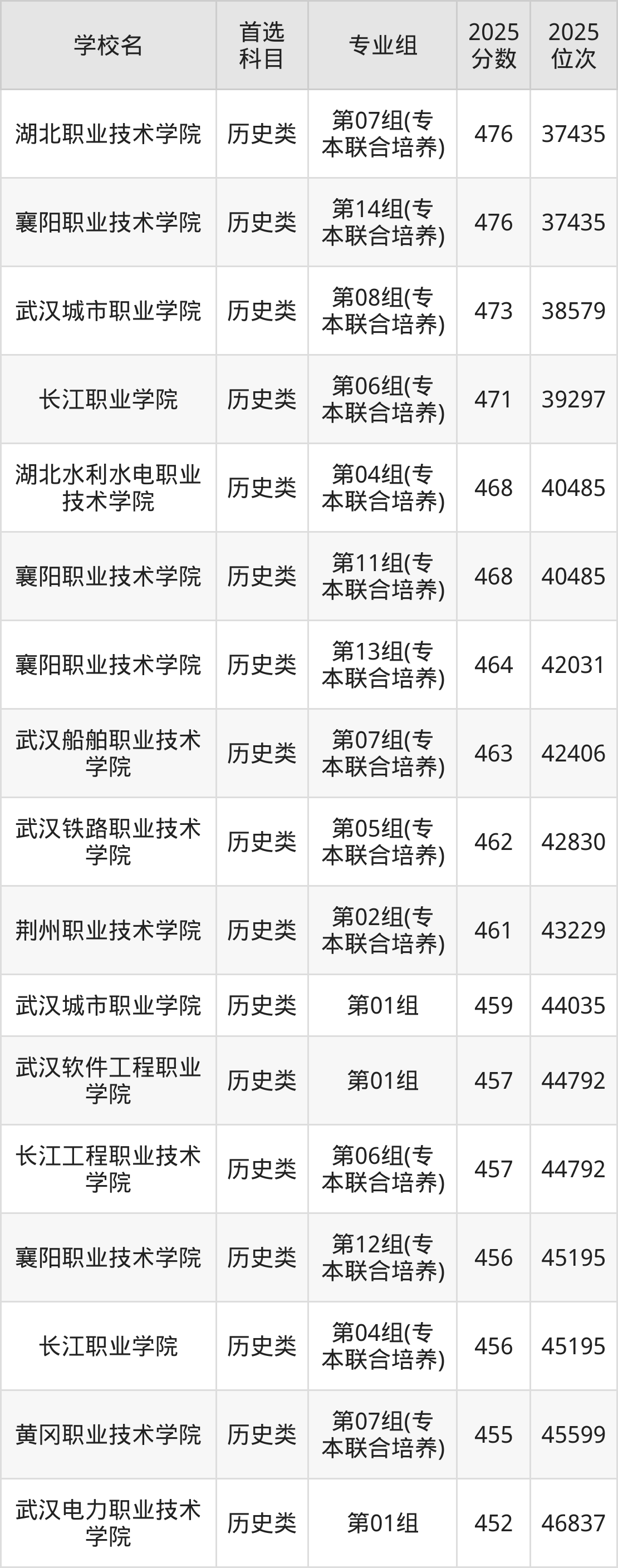(1)湖北职业技术学院第07组(专本联合培养):476分、37435名;