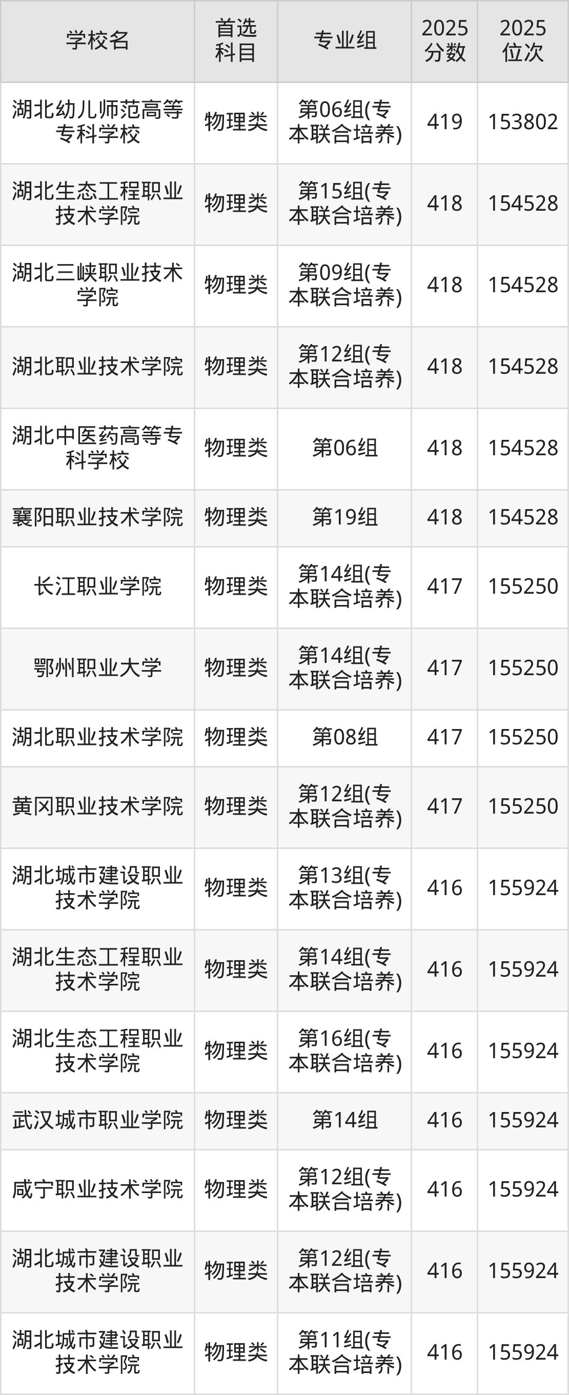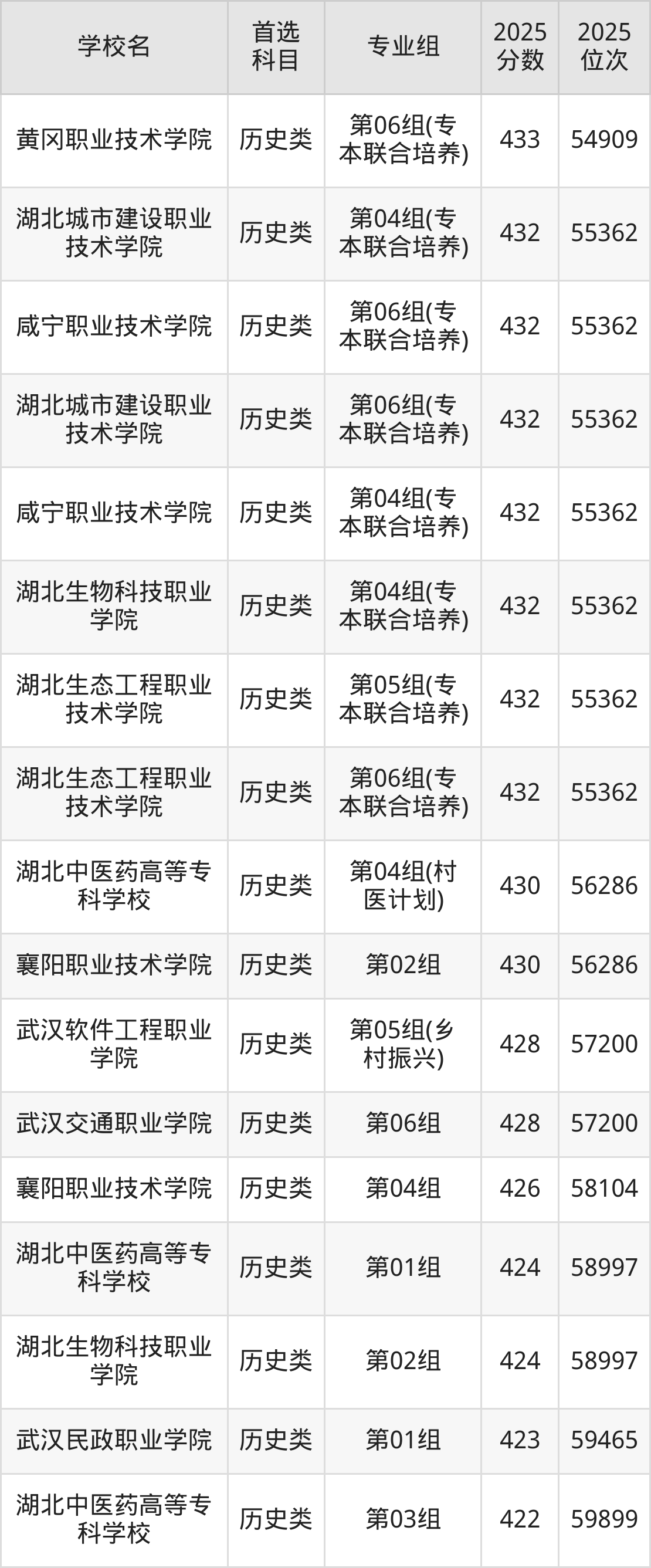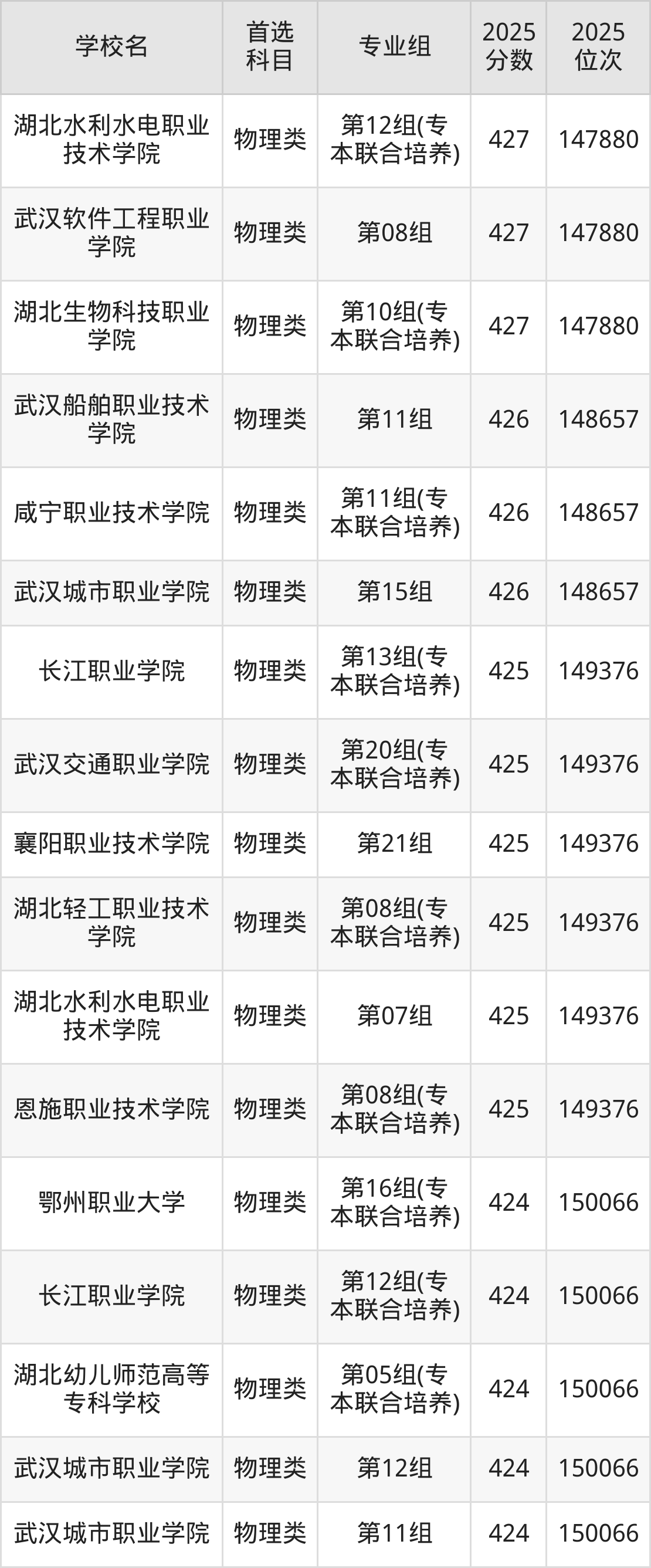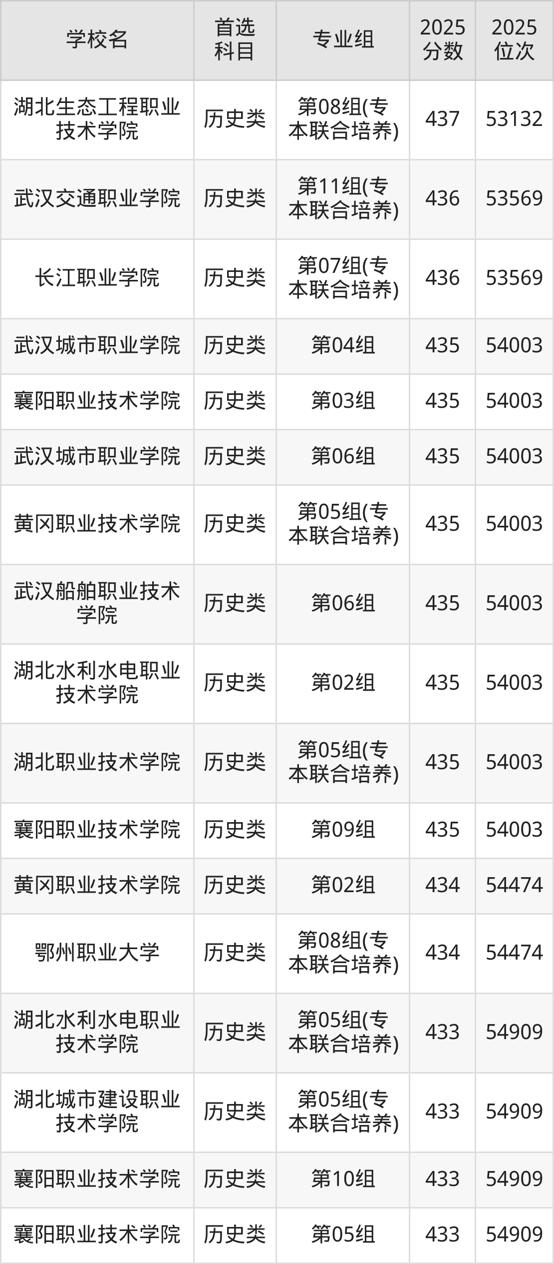 (1)湖北职业技术学院第07组(专本联合培养):476分、37435名;