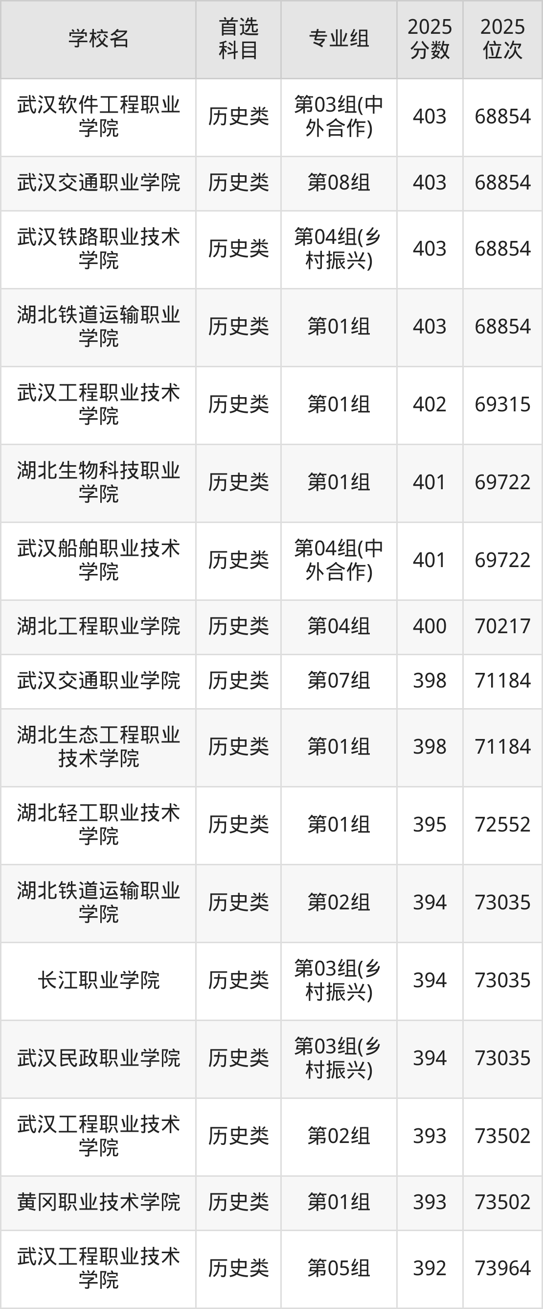 2025年一共有50所公办大专在湖北历史类招生,包含了203个专业组,录取分数线从185分到476分不等,对应最低位次从137152名到37435名。下面分别展示湖北省分数线最高、最低的五个院校专业组。