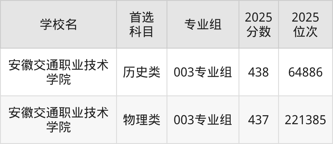 安徽交通职业技术学院003专业组:437分、221385名;