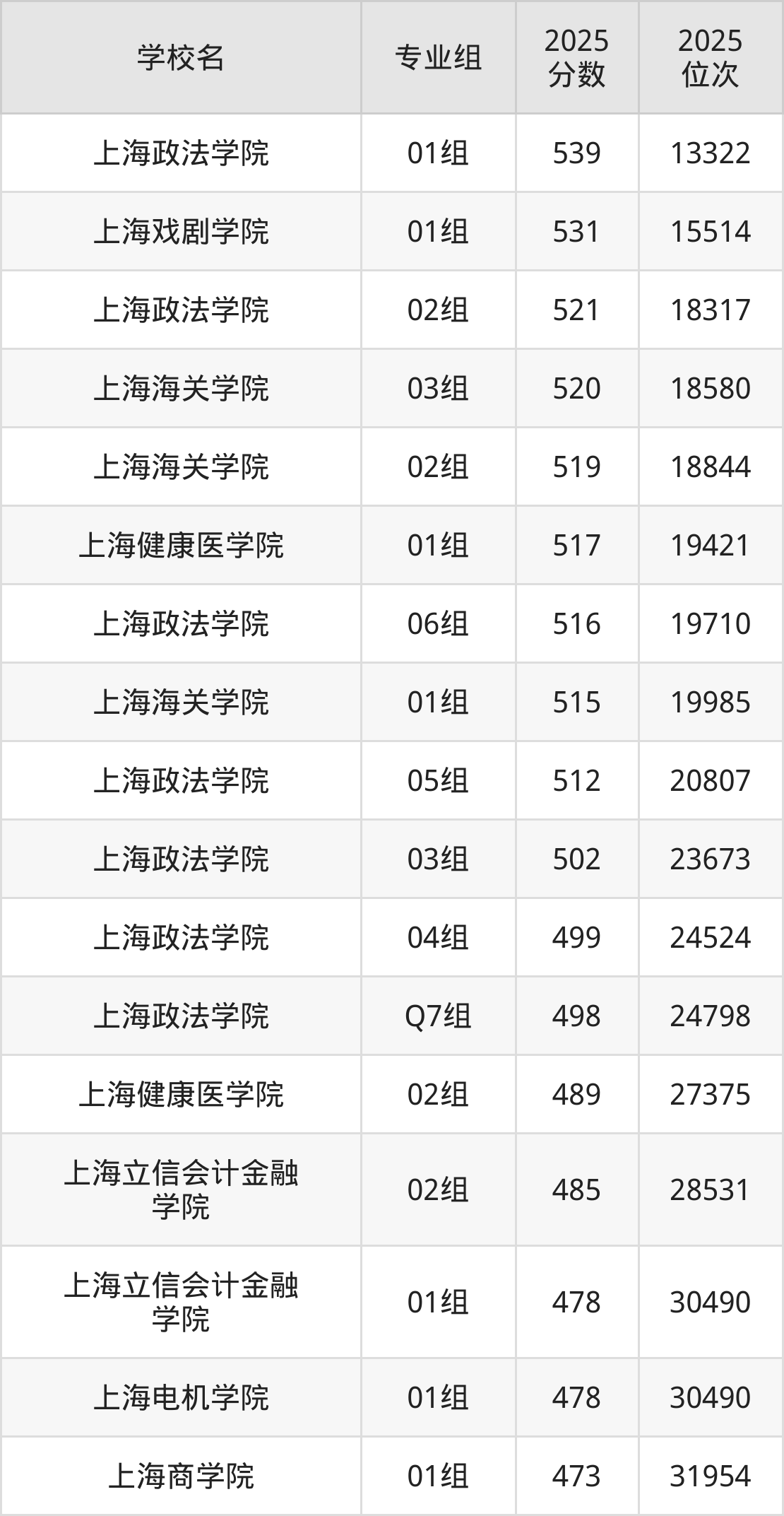2025年一共有7所公办二本大学在上海招生,包含了34个专业组,录取分数线从439分到539分不等,对应最低位次从40963名到13322名。下面分别展示上海市分数线最高、最低的五个院校专业组。