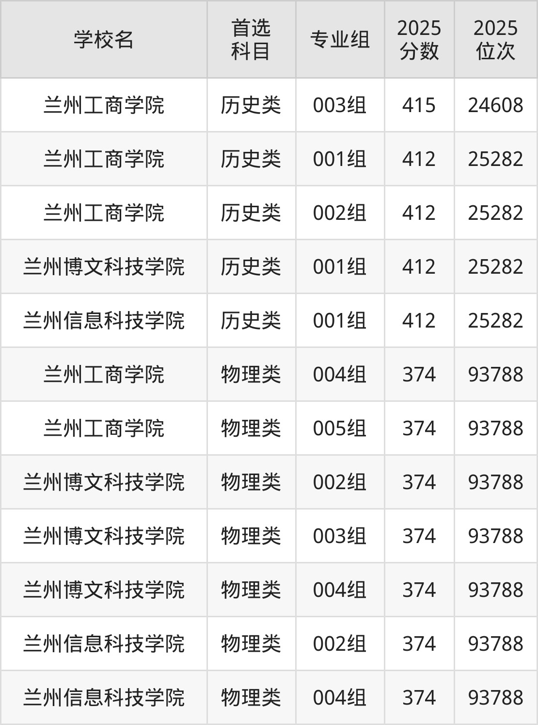 2025年兰州民办本科最低录取分数线是412分,收分最低的学校为兰州工商学院001专业组。