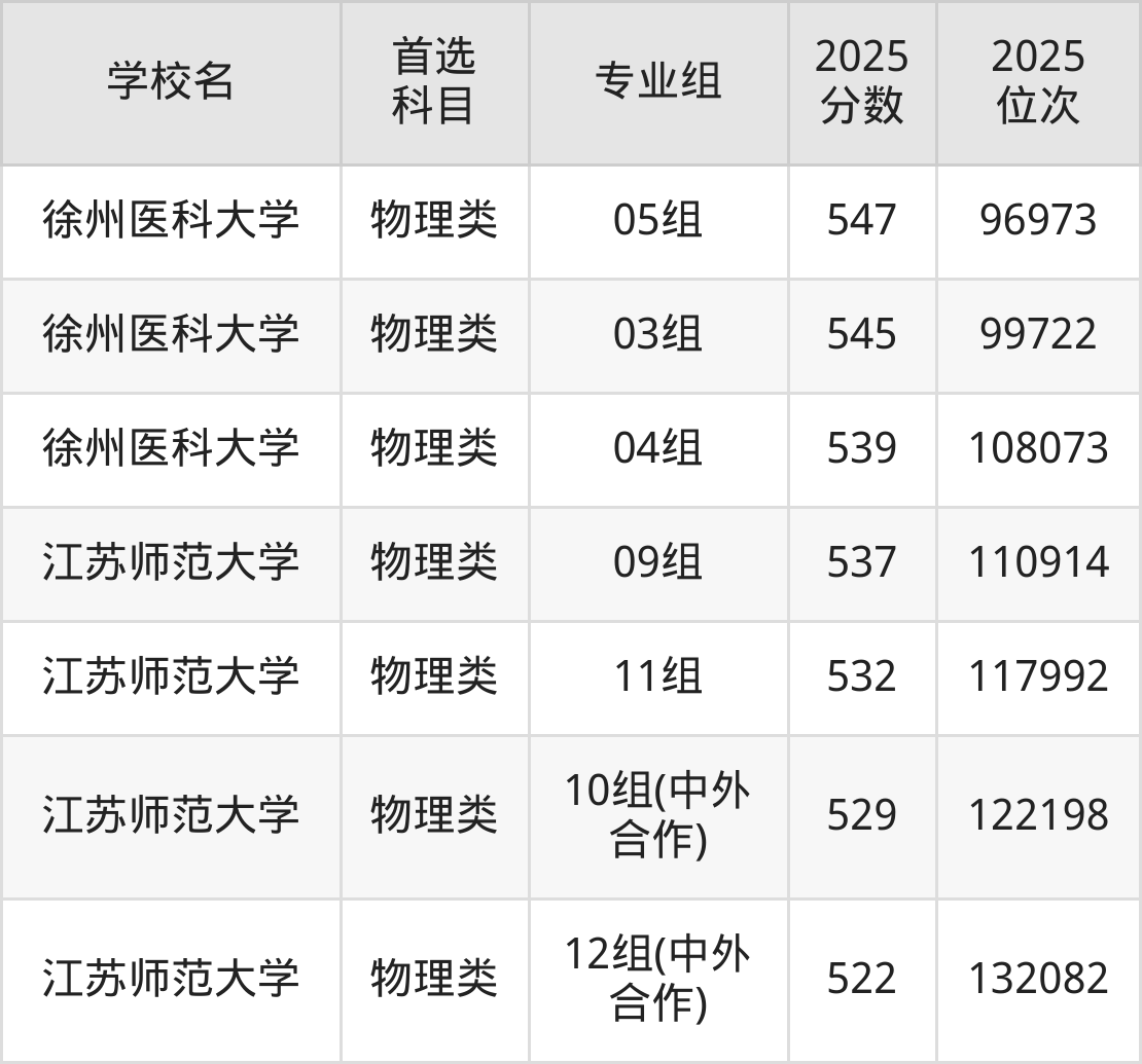 2025年一共有3所一本大学在徐州历史类招生,包含了5个专业组,录取分数线从557分到596分不等,对应最低位次从20493名到6765名。