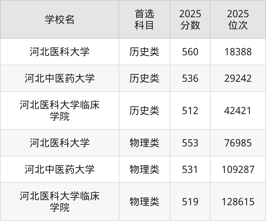 2025年一共有3所医科大学在石家庄历史类招生,录取分数线从512分到560分不等,对应最低位次从42421名到18388名。
