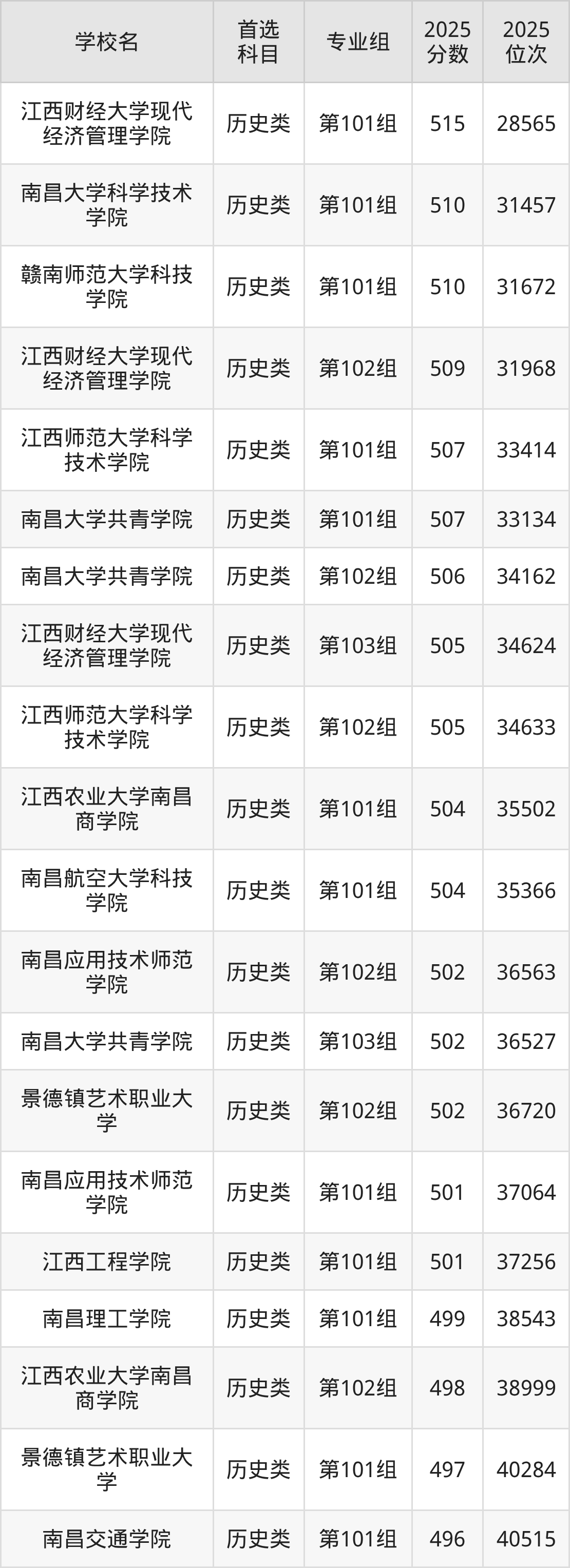 2025年一共有18所民办本科在江西历史类招生,包含了30个专业组,录取分数线从486分到515分不等,对应最低位次从47292名到28565名。下面分别展示江西省分数线最高、最低的五个院校专业组。